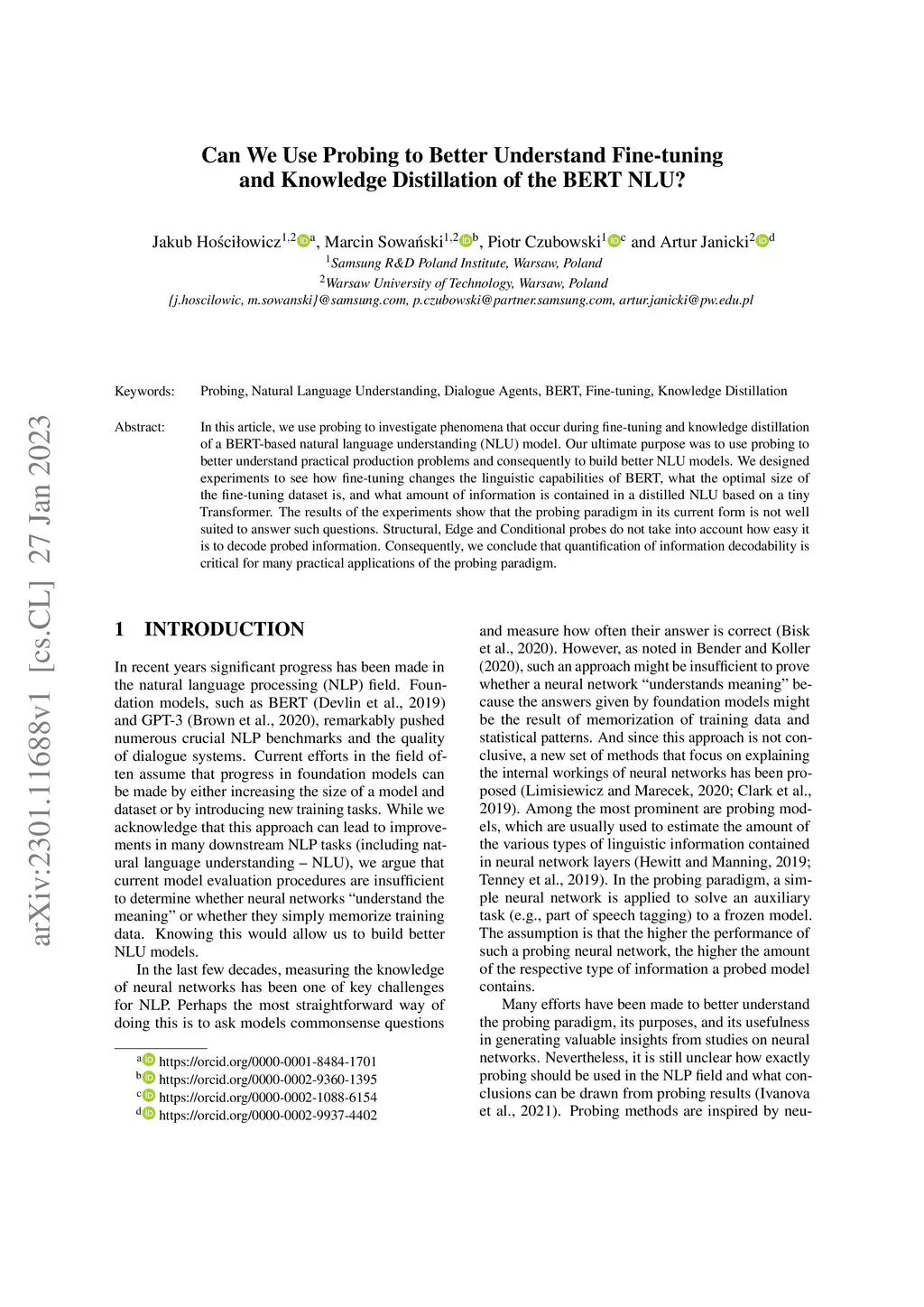 In this article, we use probing to investigate phenomena that occur during fine-tuning and knowledge distillation of a BERT-based natural language understanding (NLU) model. Our ultimate purpose was to use probing to better understand practical production problems and consequently to build better NLU models. We designed experiments to see how fine-tuning changes the linguistic capabilities of BERT, what the optimal size of the fine-tuning dataset is, and what amount of information is contained in a distilled NLU based on a tiny Transformer. The results of the experiments show that the probing paradigm in its current form is not well suited to answer such questions. Structural, Edge and Conditional probes do not take into account how easy it is to decode probed information. Consequently, we conclude that quantification of information decodability is critical for many practical applications of the probing paradigm.