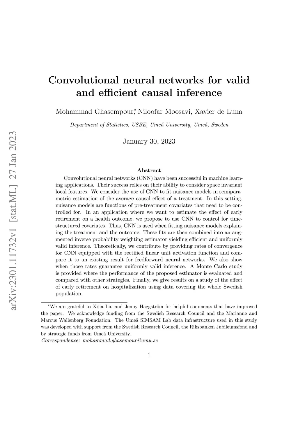 Convolutional neural networks (CNN) have been successful in machine learning applications. Their success relies on their ability to consider space invariant local features. We consider the use of CNN to fit nuisance models in semiparametric estimation of the average causal effect of a treatment. In this setting, nuisance models are functions of pre-treatment covariates that need to be controlled for. In an application where we want to estimate the effect of early retirement on a health outcome, we propose to use CNN to control for time-structured covariates. Thus, CNN is used when fitting nuisance models explaining the treatment and the outcome. These fits are then combined into an augmented inverse probability weighting estimator yielding efficient and uniformly valid inference. Theoretically, we contribute by providing rates of convergence for CNN equipped with the rectified linear unit activation function and compare it to an existing result for feedforward neural networks. We also show when those rates guarantee uniformly valid inference. A Monte Carlo study is provided where the performance of the proposed estimator is evaluated and compared with other strategies. Finally, we give results on a study of the effect of early retirement on hospitalization using data covering the whole Swedish population.