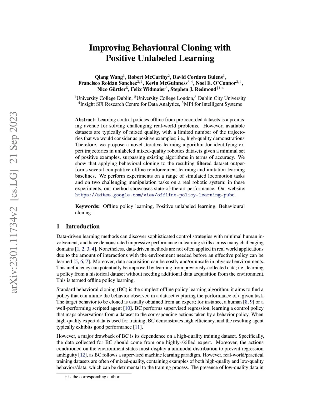 Learning control policies offline from pre-recorded datasets is a promising avenue for solving challenging real-world problems. However, available datasets are typically of mixed quality, with a limited number of the trajectories that we would consider as positive examples; i.e., high-quality demonstrations. Therefore, we propose a novel iterative learning algorithm for identifying expert trajectories in unlabeled mixed-quality robotics datasets given a minimal set of positive examples, surpassing existing algorithms in terms of accuracy. We show that applying behavioral cloning to the resulting filtered dataset outperforms several competitive offline reinforcement learning and imitation learning baselines. We perform experiments on a range of simulated locomotion tasks and on two challenging manipulation tasks on a real robotic system; in these experiments, our method showcases state-of-the-art performance. Our website: \url{https://sites.google.com/view/offline-policy-learning-pubc}.