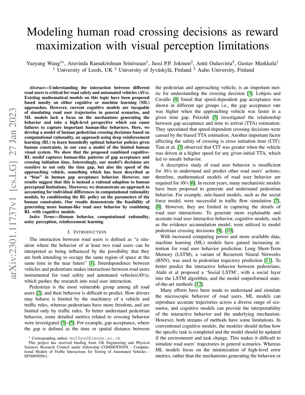 Understanding the interaction between different road users is critical for road safety and automated vehicles (AVs). Existing mathematical models on this topic have been proposed based mostly on either cognitive or machine learning (ML) approaches. However, current cognitive models are incapable of simulating road user trajectories in general scenarios, and ML models lack a focus on the mechanisms generating the behavior and take a high-level perspective which can cause failures to capture important human-like behaviors. Here, we develop a model of human pedestrian crossing decisions based on computational rationality, an approach using deep reinforcement learning (RL) to learn boundedly optimal behavior policies given human constraints, in our case a model of the limited human visual system. We show that the proposed combined cognitive-RL model captures human-like patterns of gap acceptance and crossing initiation time. Interestingly, our model's decisions are sensitive to not only the time gap, but also the speed of the approaching vehicle, something which has been described as a "bias" in human gap acceptance behavior. However, our results suggest that this is instead a rational adaption to human perceptual limitations. Moreover, we demonstrate an approach to accounting for individual differences in computational rationality models, by conditioning the RL policy on the parameters of the human constraints. Our results demonstrate the feasibility of generating more human-like road user behavior by combining RL with cognitive models.