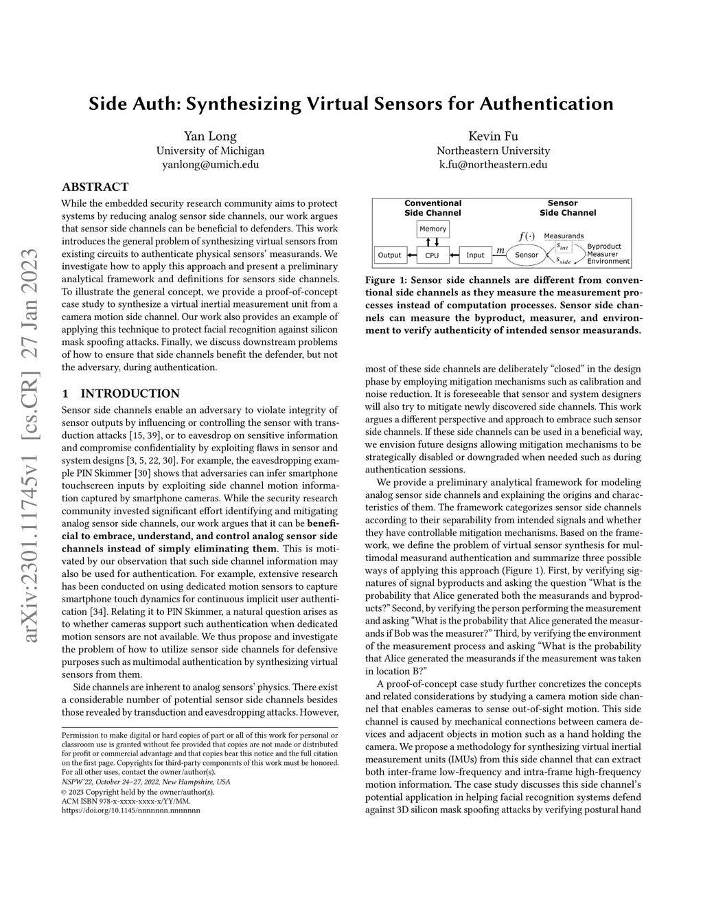 While the embedded security research community aims to protect systems by reducing analog sensor side channels, our work argues that sensor side channels can be beneficial to defenders. This work introduces the general problem of synthesizing virtual sensors from existing circuits to authenticate physical sensors' measurands. We investigate how to apply this approach and present a preliminary analytical framework and definitions for sensor side channels. To illustrate the general concept, we provide a proof-of-concept case study to synthesize a virtual inertial measurement unit from a camera motion side channel. Our work also provides an example of applying this technique to protect facial recognition against silicon mask spoofing attacks. Finally, we discuss downstream problems of how to ensure that side channels benefit the defender, but not the adversary, during authentication.