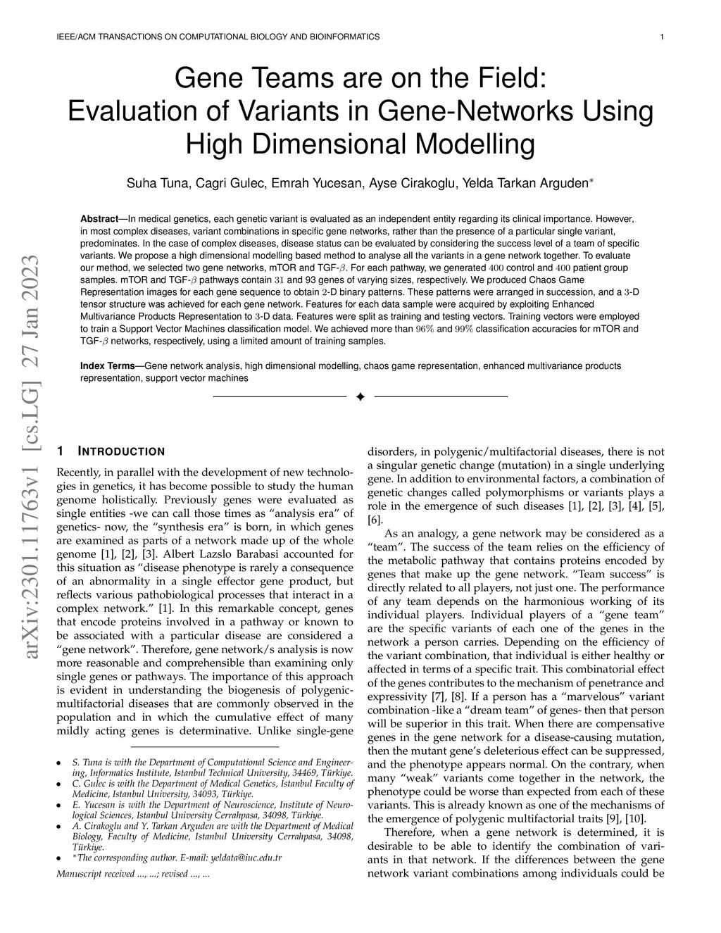 In medical genetics, each genetic variant is evaluated as an independent entity regarding its clinical importance. However, in most complex diseases, variant combinations in specific gene networks, rather than the presence of a particular single variant, predominates. In the case of complex diseases, disease status can be evaluated by considering the success level of a team of specific variants. We propose a high dimensional modelling based method to analyse all the variants in a gene network together. To evaluate our method, we selected two gene networks, mTOR and TGF-Beta. For each pathway, we generated 400 control and 400 patient group samples. mTOR and TGF-? pathways contain 31 and 93 genes of varying sizes, respectively. We produced Chaos Game Representation images for each gene sequence to obtain 2-D binary patterns. These patterns were arranged in succession, and a 3-D tensor structure was achieved for each gene network. Features for each data sample were acquired by exploiting Enhanced Multivariance Products Representation to 3-D data. Features were split as training and testing vectors. Training vectors were employed to train a Support Vector Machines classification model. We achieved more than 96% and 99% classification accuracies for mTOR and TGF-Beta networks, respectively, using a limited amount of training samples.