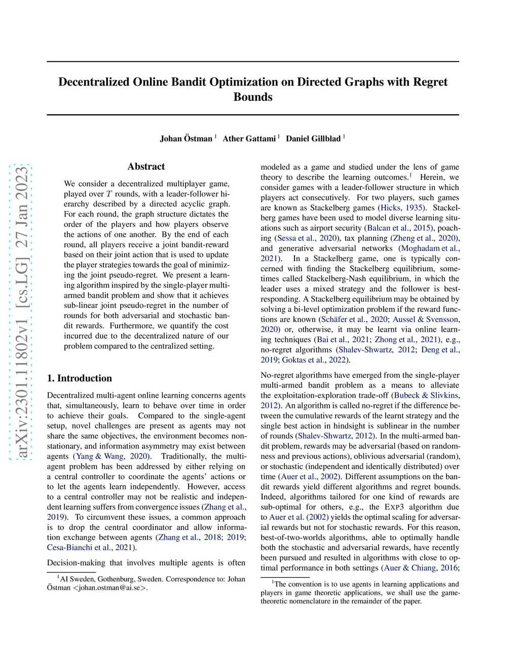 We consider a decentralized multiplayer game, played over rounds, with a leader-follower hierarchy described by a directed acyclic graph. For each round, the graph structure dictates the order of the players and how players observe the actions of one another. By the end of each round, all players receive a joint bandit-reward based on their joint action that is used to update the player strategies towards the goal of minimizing the joint pseudo-regret. We present a learning algorithm inspired by the single-player multi-armed bandit problem and show that it achieves sub-linear joint pseudo-regret in the number of rounds for both adversarial and stochastic bandit rewards. Furthermore, we quantify the cost incurred due to the decentralized nature of our problem compared to the centralized setting.