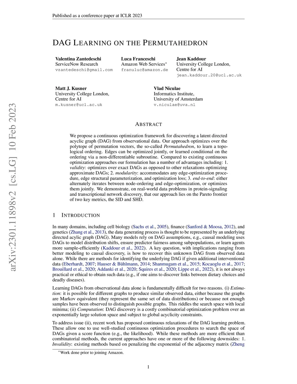 We propose a continuous optimization framework for discovering a latent directed acyclic graph (DAG) from observational data. Our approach optimizes over the polytope of permutation vectors, the so-called Permutahedron, to learn a topological ordering. Edges can be optimized jointly, or learned conditional on the ordering via a non-differentiable subroutine. Compared to existing continuous optimization approaches our formulation has a number of advantages including: 1. validity: optimizes over exact DAGs as opposed to other relaxations optimizing approximate DAGs; 2. modularity: accommodates any edge-optimization procedure, edge structural parameterization, and optimization loss; 3. end-to-end: either alternately iterates between node-ordering and edge-optimization, or optimizes them jointly. We demonstrate, on real-world data problems in protein-signaling and transcriptional network discovery, that our approach lies on the Pareto frontier of two key metrics, the SID and SHD.
