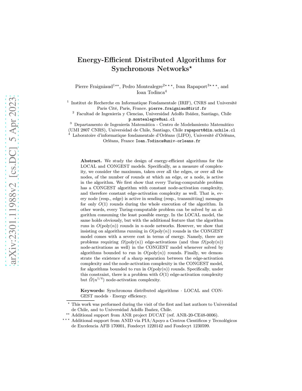 We study the design of energy-efficient algorithms for the LOCAL and CONGEST models. Specifically, as a measure of complexity, we consider the maximum, taken over all the edges, or over all the nodes, of the number of rounds at which an edge, or a node, is active in the algorithm. We first show that every Turing-computable problem has a CONGEST algorithm with constant node-activation complexity, and therefore constant edge-activation complexity as well. That is, every node (resp., edge) is active in sending (resp., transmitting) messages for only rounds during the whole execution of the algorithm. In other words, every Turing-computable problem can be solved by an algorithm consuming the least possible energy. In the LOCAL model, the same holds obviously, but with the additional feature that the algorithm runs in rounds in -node networks. However, we show that insisting on algorithms running in rounds in the CONGEST model comes with a severe cost in terms of energy. Namely, there are problems requiring edge-activations (and thus node-activations as well) in the CONGEST model whenever solved by algorithms bounded to run in rounds. Finally, we demonstrate the existence of a sharp separation between the edge-activation complexity and the node-activation complexity in the CONGEST model, for algorithms bounded to run in rounds. Specifically, under this constraint, there is a problem with edge-activation complexity but node-activation complexity.