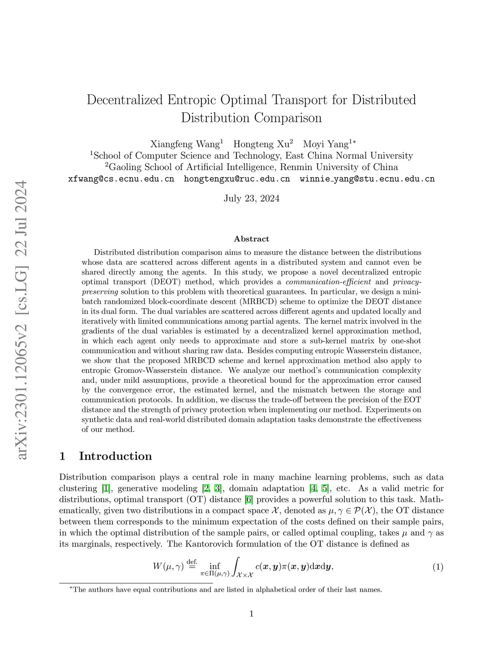 Privacy-preserving distributed distribution comparison measures the distance between the distributions whose data are scattered across different agents in a distributed system and cannot be shared among the agents. In this study, we propose a novel decentralized entropic optimal transport (EOT) method, which provides a privacy-preserving and communication-efficient solution to this problem with theoretical guarantees. In particular, we design a mini-batch randomized block-coordinate descent (MRBCD) scheme to optimize the decentralized EOT distance in its dual form. The dual variables are scattered across different agents and updated locally and iteratively with limited communications among partial agents. The kernel matrix involved in the gradients of the dual variables is estimated by a distributed kernel approximation method, and each agent only needs to approximate and store a sub-kernel matrix by one-shot communication and without sharing raw data. We analyze our method's communication complexity and provide a theoretical bound for the approximation error caused by the convergence error, the approximated kernel, and the mismatch between the storage and communication protocols. Experiments on synthetic data and real-world distributed domain adaptation tasks demonstrate the effectiveness of our method.