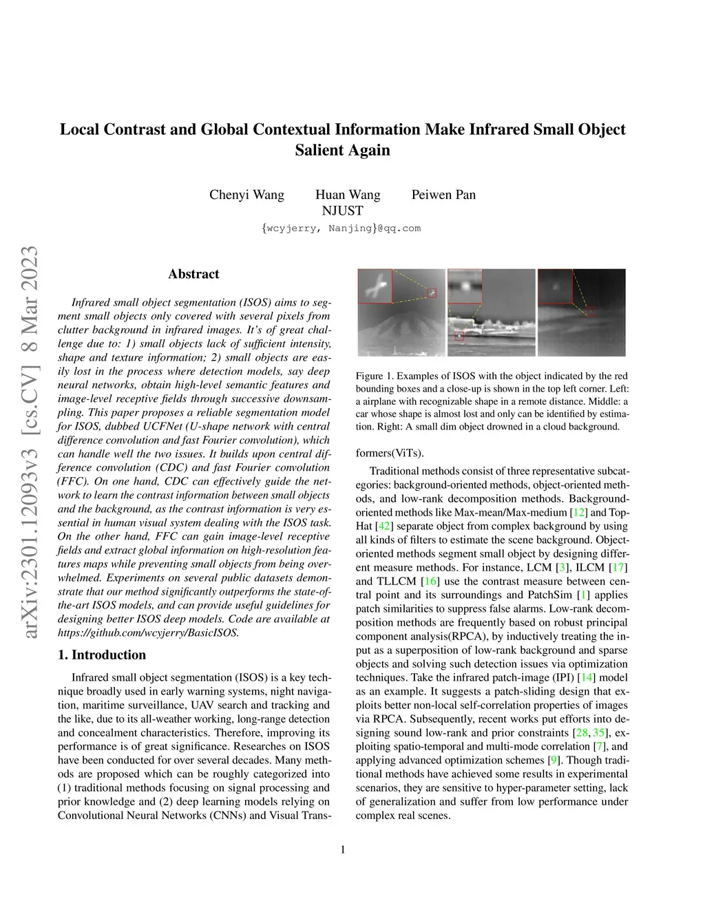 Infrared small object detection (ISOS) aims to segment small objects only covered with several pixels from clutter background in infrared images. It's of great challenge due to: 1) small objects lack of sufficient intensity, shape and texture information; 2) small objects are easily lost in the process where detection models, say deep neural networks, obtain high-level semantic features and image-level receptive fields through successive downsampling. This paper proposes a reliable detection model for ISOS, dubbed UCFNet, which can handle well the two issues. It builds upon central difference convolution (CDC) and fast Fourier convolution (FFC). On one hand, CDC can effectively guide the network to learn the contrast information between small objects and the background, as the contrast information is very essential in human visual system dealing with the ISOS task. On the other hand, FFC can gain image-level receptive fields and extract global information while preventing small objects from being overwhelmed.Experiments on several public datasets demonstrate that our method significantly outperforms the state-of-the-art ISOS models, and can provide useful guidelines for designing better ISOS deep models. Code are available at https://github.com/wcyjerry/BasicISOS.