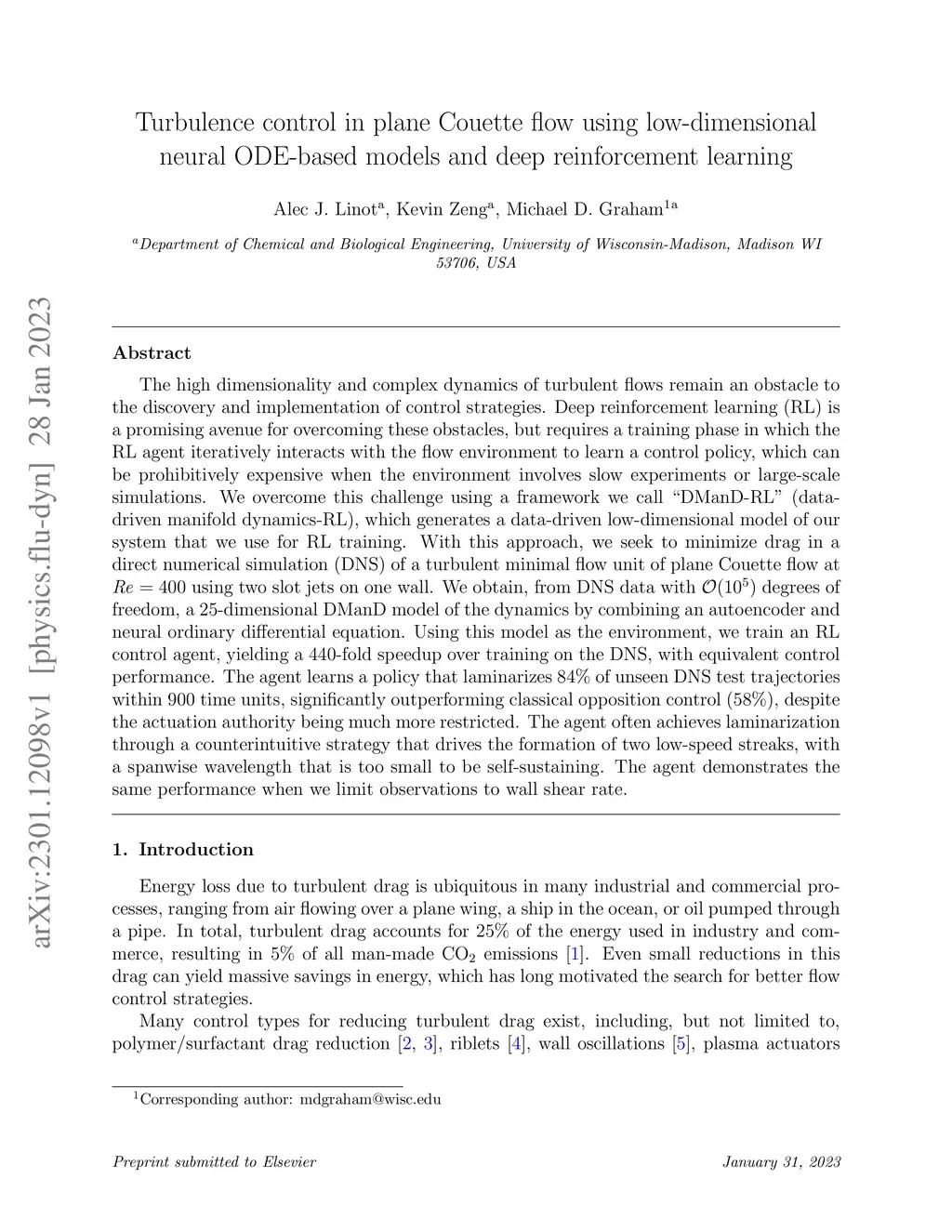 The high dimensionality and complex dynamics of turbulent flows remain an obstacle to the discovery and implementation of control strategies. Deep reinforcement learning (RL) is a promising avenue for overcoming these obstacles, but requires a training phase in which the RL agent iteratively interacts with the flow environment to learn a control policy, which can be prohibitively expensive when the environment involves slow experiments or large-scale simulations. We overcome this challenge using a framework we call "DManD-RL" (data-driven manifold dynamics-RL), which generates a data-driven low-dimensional model of our system that we use for RL training. With this approach, we seek to minimize drag in a direct numerical simulation (DNS) of a turbulent minimal flow unit of plane Couette flow at Re=400 using two slot jets on one wall. We obtain, from DNS data with degrees of freedom, a 25-dimensional DManD model of the dynamics by combining an autoencoder and neural ordinary differential equation. Using this model as the environment, we train an RL control agent, yielding a 440-fold speedup over training on the DNS, with equivalent control performance. The agent learns a policy that laminarizes 84% of unseen DNS test trajectories within 900 time units, significantly outperforming classical opposition control (58%), despite the actuation authority being much more restricted. The agent often achieves laminarization through a counterintuitive strategy that drives the formation of two low-speed streaks, with a spanwise wavelength that is too small to be self-sustaining. The agent demonstrates the same performance when we limit observations to wall shear rate.