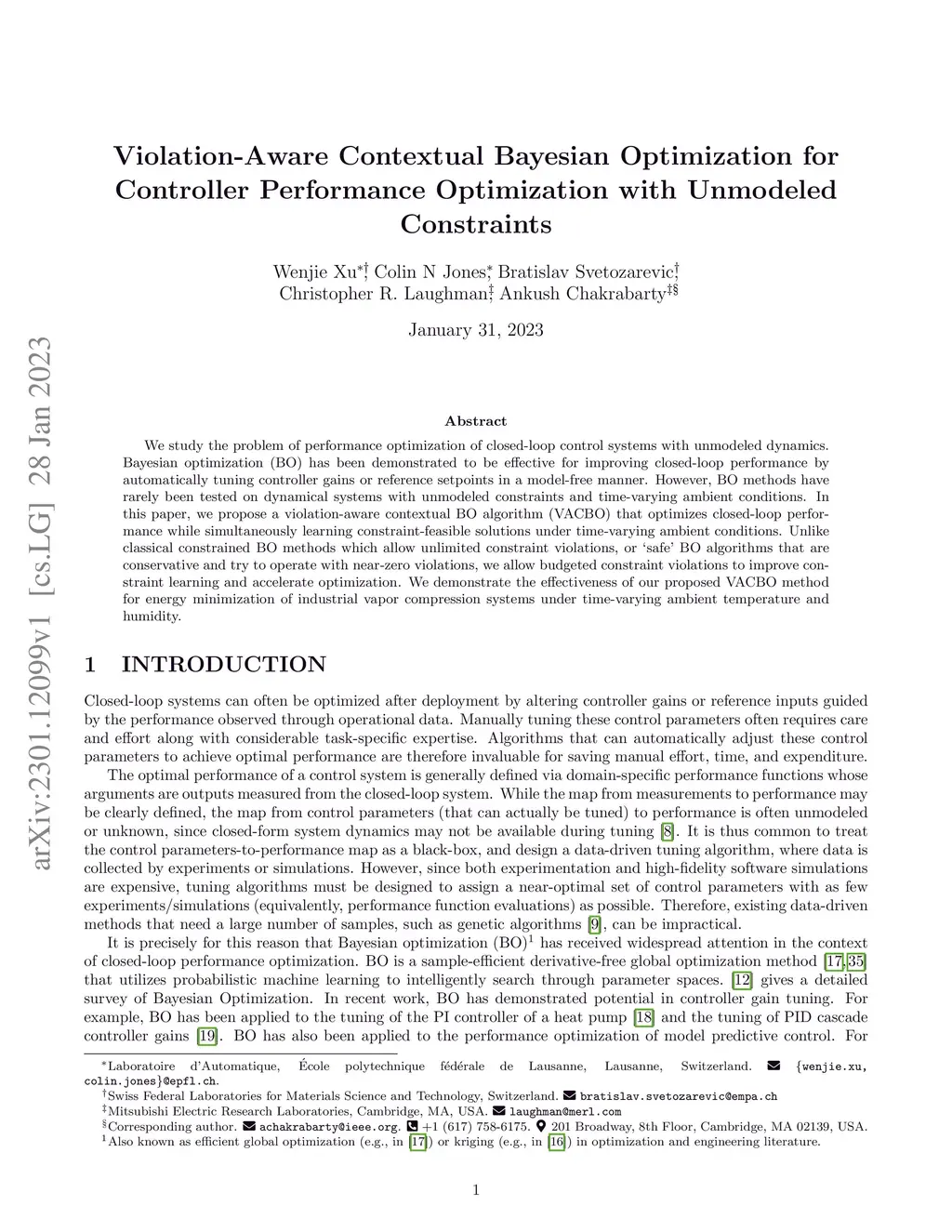 We study the problem of performance optimization of closed-loop control systems with unmodeled dynamics. Bayesian optimization (BO) has been demonstrated to be effective for improving closed-loop performance by automatically tuning controller gains or reference setpoints in a model-free manner. However, BO methods have rarely been tested on dynamical systems with unmodeled constraints and time-varying ambient conditions. In this paper, we propose a violation-aware contextual BO algorithm (VACBO) that optimizes closed-loop performance while simultaneously learning constraint-feasible solutions under time-varying ambient conditions. Unlike classical constrained BO methods which allow unlimited constraint violations, or 'safe' BO algorithms that are conservative and try to operate with near-zero violations, we allow budgeted constraint violations to improve constraint learning and accelerate optimization. We demonstrate the effectiveness of our proposed VACBO method for energy minimization of industrial vapor compression systems under time-varying ambient temperature and humidity.
