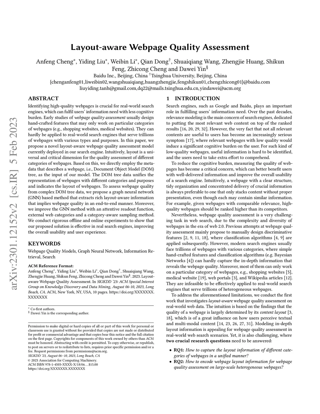 Identifying high-quality webpages is fundamental for real-world search engines, which can fulfil users' information need with the less cognitive burden. Early studies of \emph{webpage quality assessment} usually design hand-crafted features that may only work on particular categories of webpages (e.g., shopping websites, medical websites). They can hardly be applied to real-world search engines that serve trillions of webpages with various types and purposes. In this paper, we propose a novel layout-aware webpage quality assessment model currently deployed in our search engine. Intuitively, layout is a universal and critical dimension for the quality assessment of different categories of webpages. Based on this, we directly employ the meta-data that describes a webpage, i.e., Document Object Model (DOM) tree, as the input of our model. The DOM tree data unifies the representation of webpages with different categories and purposes and indicates the layout of webpages. To assess webpage quality from complex DOM tree data, we propose a graph neural network (GNN) based method that extracts rich layout-aware information that implies webpage quality in an end-to-end manner. Moreover, we improve the GNN method with an attentive readout function, external web categories and a category-aware sampling method. We conduct rigorous offline and online experiments to show that our proposed solution is effective in real search engines, improving the overall usability and user experience.