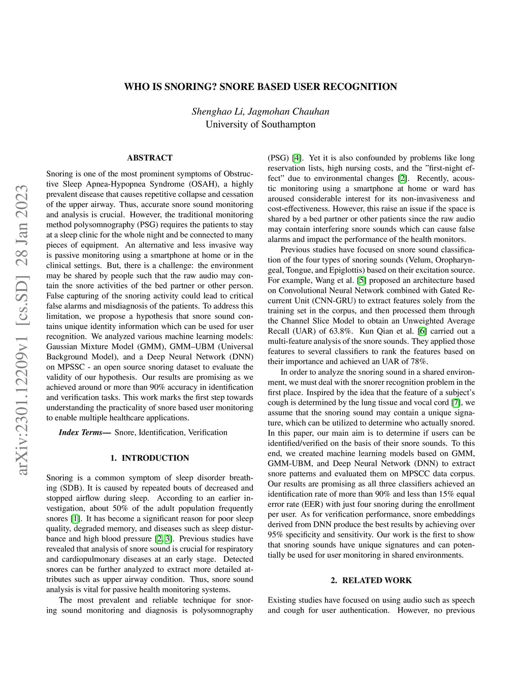 Snoring is one of the most prominent symptoms of Obstructive Sleep Apnea-Hypopnea Syndrome (OSAH), a highly prevalent disease that causes repetitive collapse and cessation of the upper airway. Thus, accurate snore sound monitoring and analysis is crucial. However, the traditional monitoring method polysomnography (PSG) requires the patients to stay at a sleep clinic for the whole night and be connected to many pieces of equipment. An alternative and less invasive way is passive monitoring using a smartphone at home or in the clinical settings. But, there is a challenge: the environment may be shared by people such that the raw audio may contain the snore activities of the bed partner or other person. False capturing of the snoring activity could lead to critical false alarms and misdiagnosis of the patients. To address this limitation, we propose a hypothesis that snore sound contains unique identity information which can be used for user recognition. We analyzed various machine learning models: Gaussian Mixture Model (GMM), GMM-UBM (Universial Background Model), and a Deep Neural Network (DNN) on MPSSC - an open source snoring dataset to evaluate the validity of our hypothesis. Our results are promising as we achieved around 90% accuracy in identification and verification tasks. This work marks the first step towards understanding the practicality of snore based user monitoring to enable multiple healthcare applicaitons.
