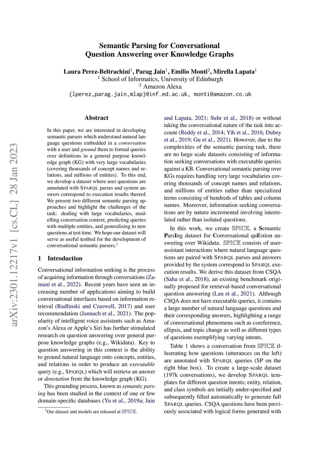 In this paper, we are interested in developing semantic parsers which understand natural language questions embedded in a conversation with a user and ground them to formal queries over definitions in a general purpose knowledge graph (KG) with very large vocabularies (covering thousands of concept names and relations, and millions of entities). To this end, we develop a dataset where user questions are annotated with Sparql parses and system answers correspond to execution results thereof. We present two different semantic parsing approaches and highlight the challenges of the task: dealing with large vocabularies, modelling conversation context, predicting queries with multiple entities, and generalising to new questions at test time. We hope our dataset will serve as useful testbed for the development of conversational semantic parsers. Our dataset and models are released at https://github.com/EdinburghNLP/SPICE.