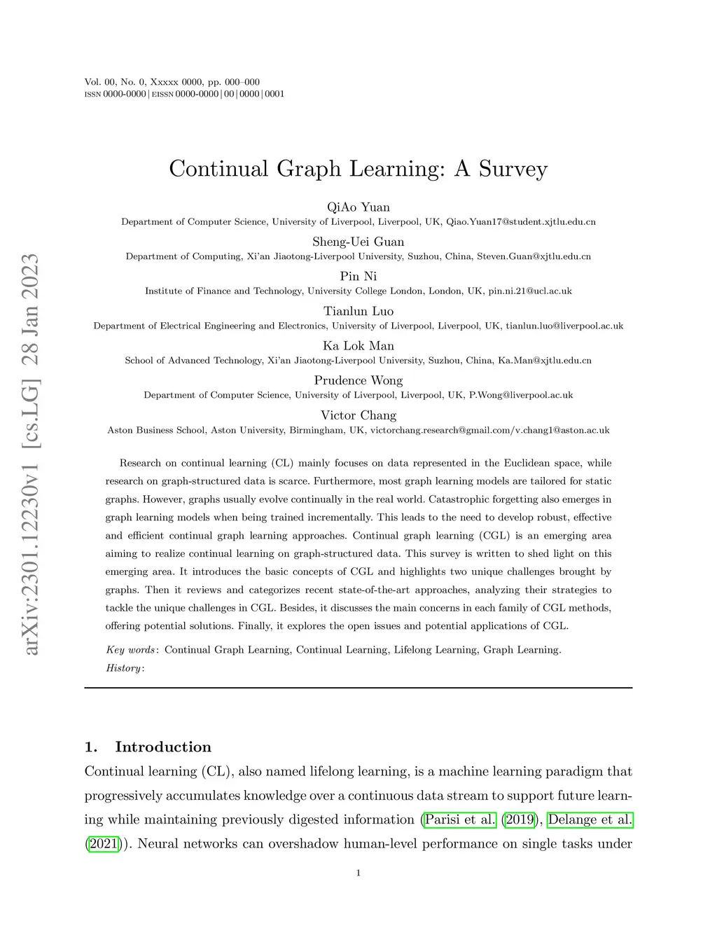 Research on continual learning (CL) mainly focuses on data represented in the Euclidean space, while research on graph-structured data is scarce. Furthermore, most graph learning models are tailored for static graphs. However, graphs usually evolve continually in the real world. Catastrophic forgetting also emerges in graph learning models when being trained incrementally. This leads to the need to develop robust, effective and efficient continual graph learning approaches. Continual graph learning (CGL) is an emerging area aiming to realize continual learning on graph-structured data. This survey is written to shed light on this emerging area. It introduces the basic concepts of CGL and highlights two unique challenges brought by graphs. Then it reviews and categorizes recent state-of-the-art approaches, analyzing their strategies to tackle the unique challenges in CGL. Besides, it discusses the main concerns in each family of CGL methods, offering potential solutions. Finally, it explores the open issues and potential applications of CGL.