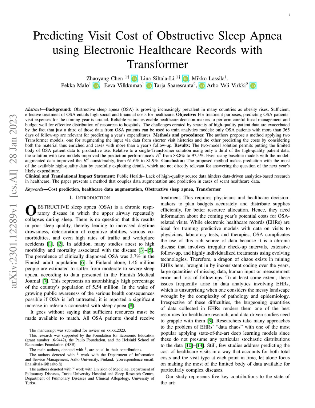 Background: Obstructive sleep apnea (OSA) is growing increasingly prevalent in many countries as obesity rises. Sufficient, effective treatment of OSA entails high social and financial costs for healthcare. Objective: For treatment purposes, predicting OSA patients' visit expenses for the coming year is crucial. Reliable estimates enable healthcare decision-makers to perform careful fiscal management and budget well for effective distribution of resources to hospitals. The challenges created by scarcity of high-quality patient data are exacerbated by the fact that just a third of those data from OSA patients can be used to train analytics models: only OSA patients with more than 365 days of follow-up are relevant for predicting a year's expenditures. Methods and procedures: The authors propose a method applying two Transformer models, one for augmenting the input via data from shorter visit histories and the other predicting the costs by considering both the material thus enriched and cases with more than a year's follow-up. Results: The two-model solution permits putting the limited body of OSA patient data to productive use. Relative to a single-Transformer solution using only a third of the high-quality patient data, the solution with two models improved the prediction performance's from 88.8% to 97.5%. Even using baseline models with the model-augmented data improved the considerably, from 61.6% to 81.9%. Conclusion: The proposed method makes prediction with the most of the available high-quality data by carefully exploiting details, which are not directly relevant for answering the question of the next year's likely expenditure.