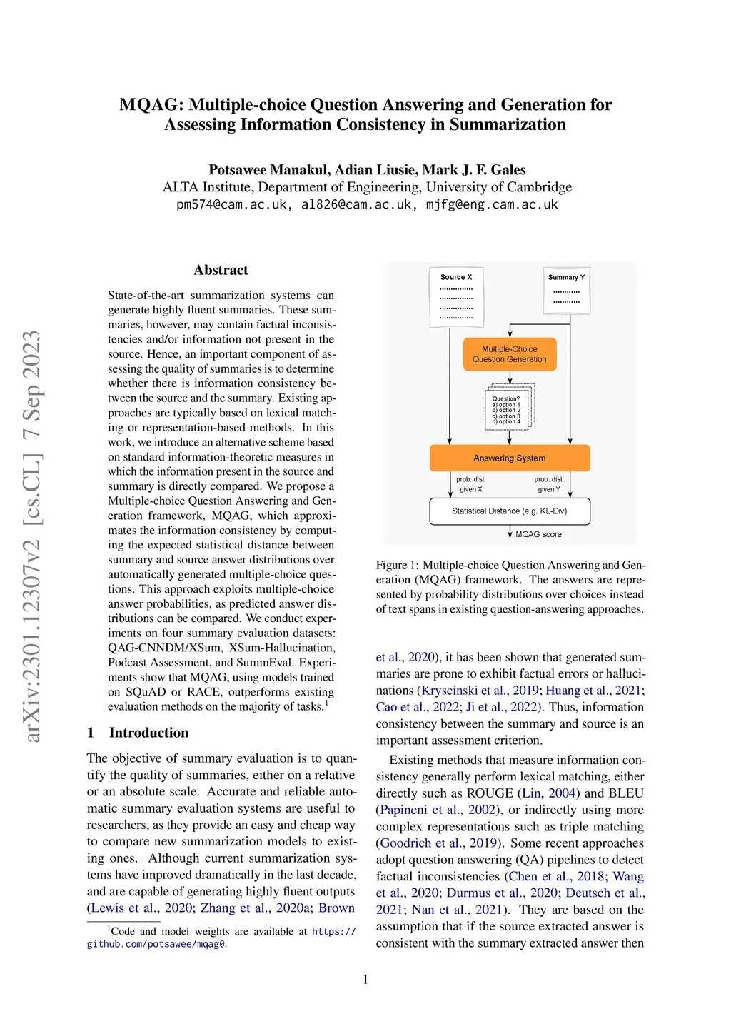 State-of-the-art summarization systems can generate highly fluent summaries. These summaries, however, may contain factual inconsistencies and/or information not present in the source. Hence, an important component of assessing the quality of summaries is to determine whether there is information consistency between the source and the summary. Existing approaches are typically based on lexical matching or representation-based methods. In this work, we introduce an alternative scheme based on standard information-theoretic measures in which the information present in the source and summary is directly compared. We propose a Multiple-choice Question Answering and Generation framework, MQAG, which approximates the information consistency by computing the expected statistical distance between summary and source answer distributions over automatically generated multiple-choice questions. This approach exploits multiple-choice answer probabilities, as predicted answer distributions can be compared. We conduct experiments on four summary evaluation datasets: QAG-CNNDM/XSum, XSum-Hallucination, Podcast Assessment, and SummEval. Experiments show that MQAG, using models trained on SQuAD or RACE, outperforms existing evaluation methods on the majority of tasks.