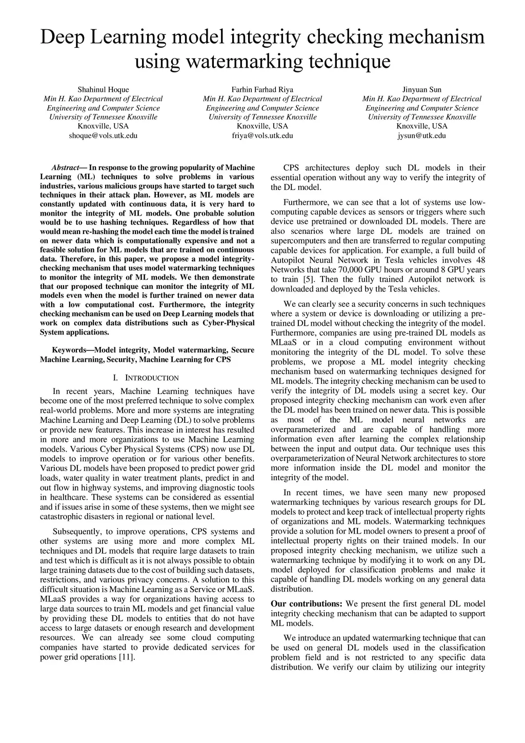 Deep Learning model integrity checking mechanism using watermarking technique