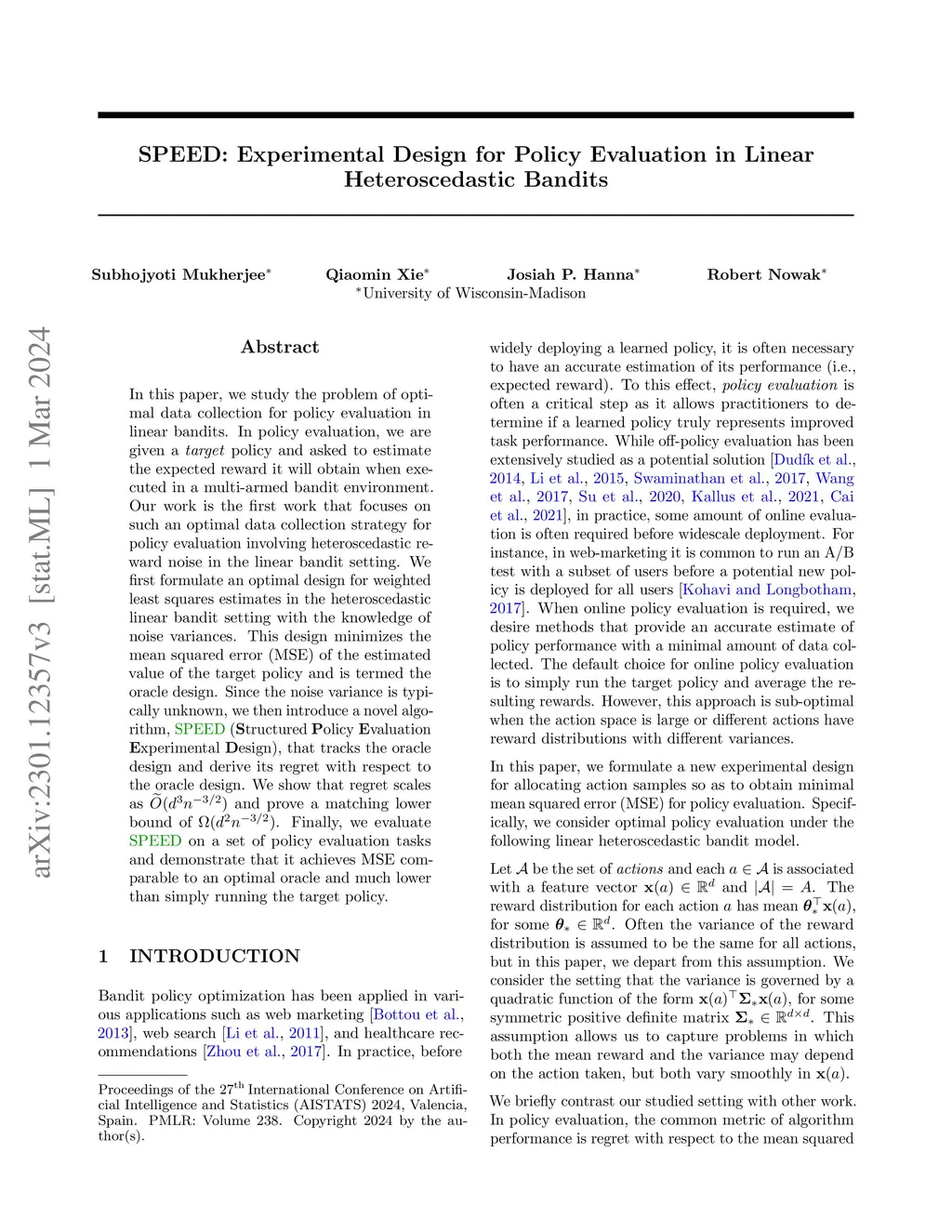 SPEED: Experimental Design for Policy Evaluation in Linear