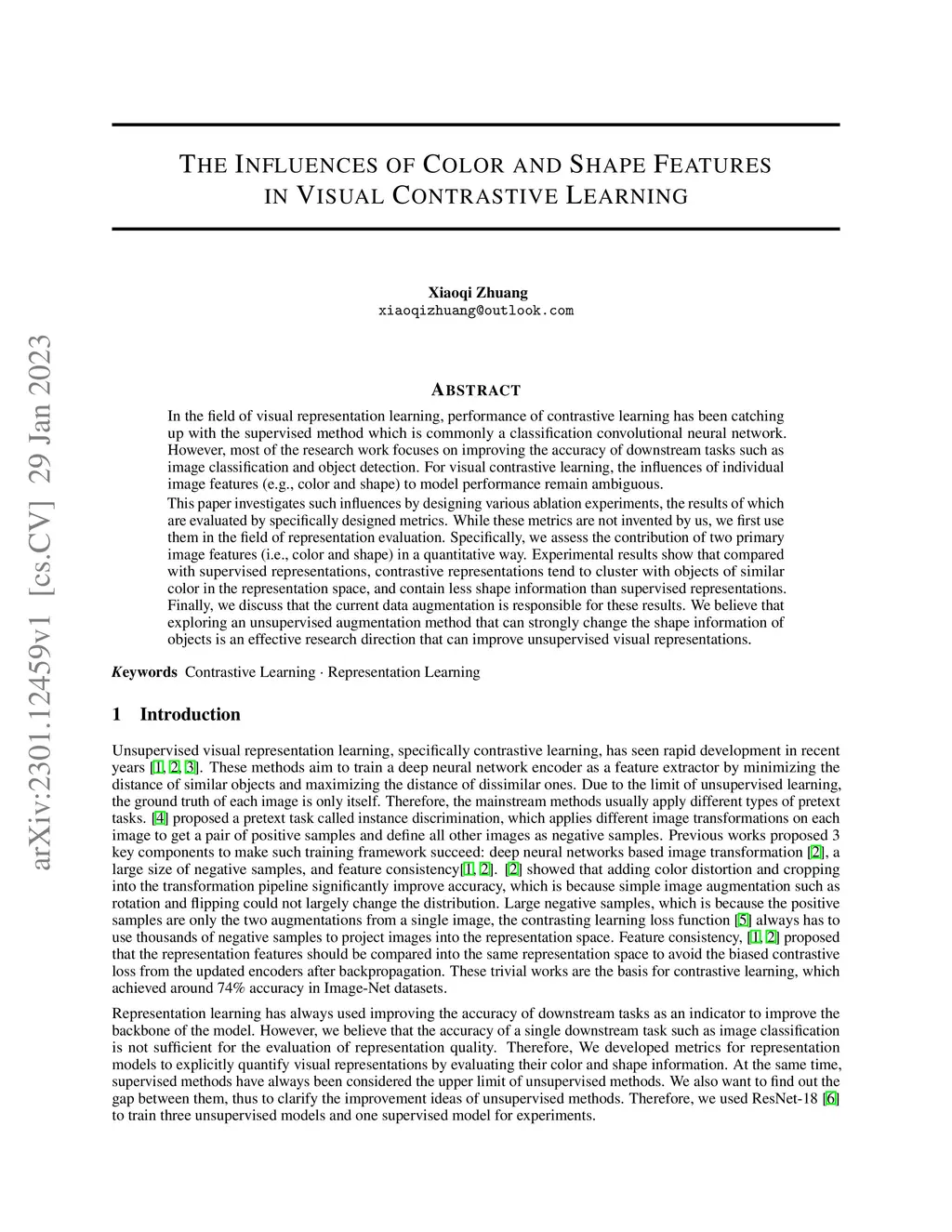 In the field of visual representation learning, performance of contrastive learning has been catching up with the supervised method which is commonly a classification convolutional neural network. However, most of the research work focuses on improving the accuracy of downstream tasks such as image classification and object detection. For visual contrastive learning, the influences of individual image features (e.g., color and shape) to model performance remain ambiguous. This paper investigates such influences by designing various ablation experiments, the results of which are evaluated by specifically designed metrics. While these metrics are not invented by us, we first use them in the field of representation evaluation. Specifically, we assess the contribution of two primary image features (i.e., color and shape) in a quantitative way. Experimental results show that compared with supervised representations, contrastive representations tend to cluster with objects of similar color in the representation space, and contain less shape information than supervised representations. Finally, we discuss that the current data augmentation is responsible for these results. We believe that exploring an unsupervised augmentation method that
