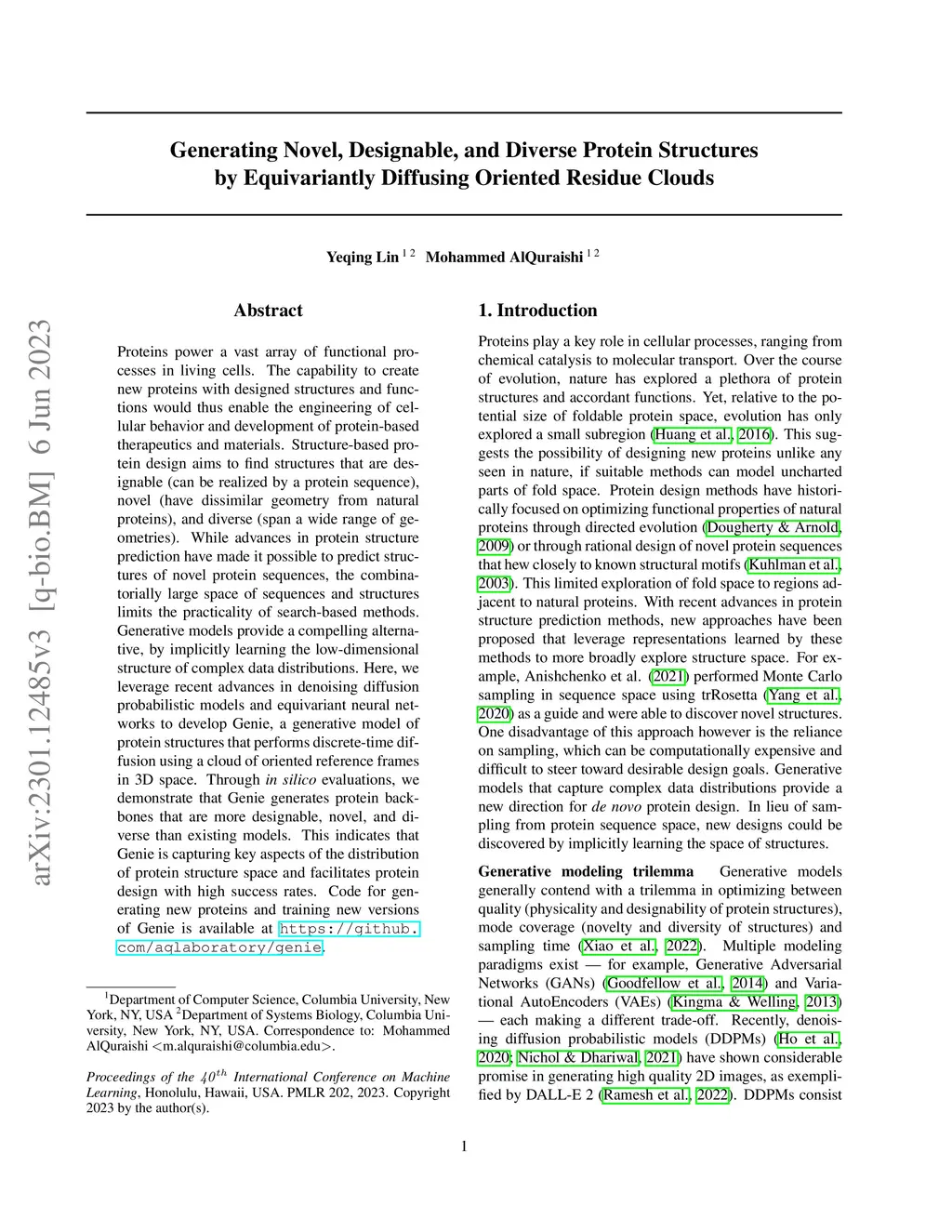 Proteins power a vast array of functional processes in living cells. The capability to create new proteins with designed structures and functions would thus enable the engineering of cellular behavior and development of protein-based therapeutics and materials. Structure-based protein design aims to find structures that are designable (can be realized by a protein sequence), novel (have dissimilar geometry from natural proteins), and diverse (span a wide range of geometries). While advances in protein structure prediction have made it possible to predict structures of novel protein sequences, the combinatorially large space of sequences and structures limits the practicality of search-based methods. Generative models provide a compelling alternative, by implicitly learning the low-dimensional structure of complex data distributions. Here, we leverage recent advances in denoising diffusion probabilistic models and equivariant neural networks to develop Genie, a generative model of protein structures that performs discrete-time diffusion using a cloud of oriented reference frames in 3D space. Through in silico evaluations, we demonstrate that Genie generates protein backbones that are more designable, novel, and diverse than existing models. This indicates that Genie is capturing key aspects of the distribution of protein structure space and facilitates protein design with high success rates. Code for generating new proteins and training new versions of Genie is available at https://github.com/aqlaboratory/genie.