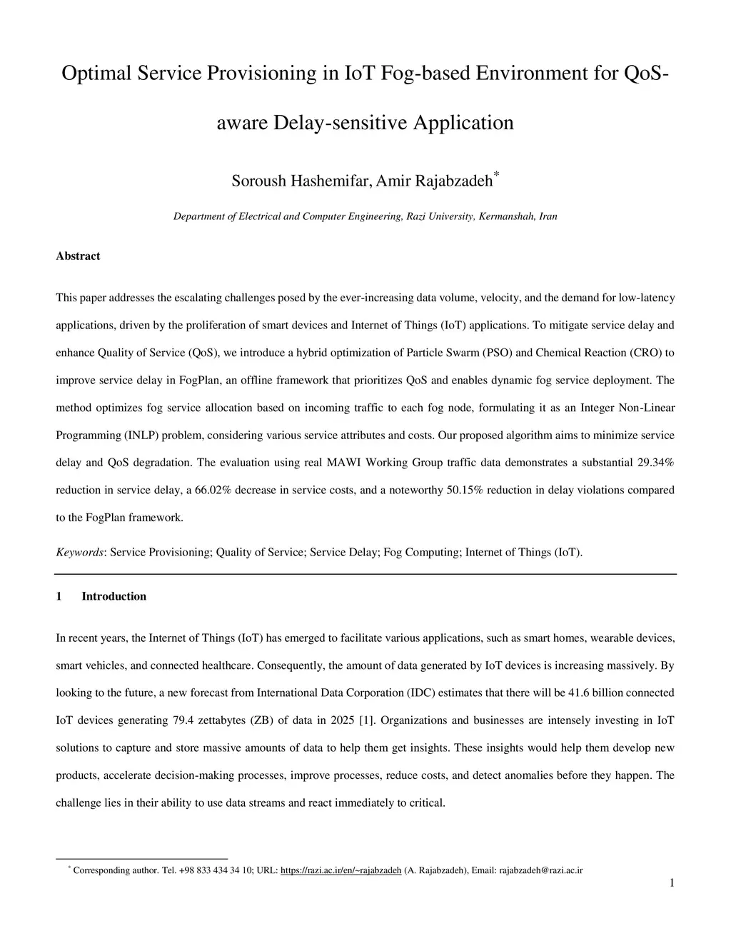 Optimal Service Provisioning in IoT Fog-based Environment for QoS-aware