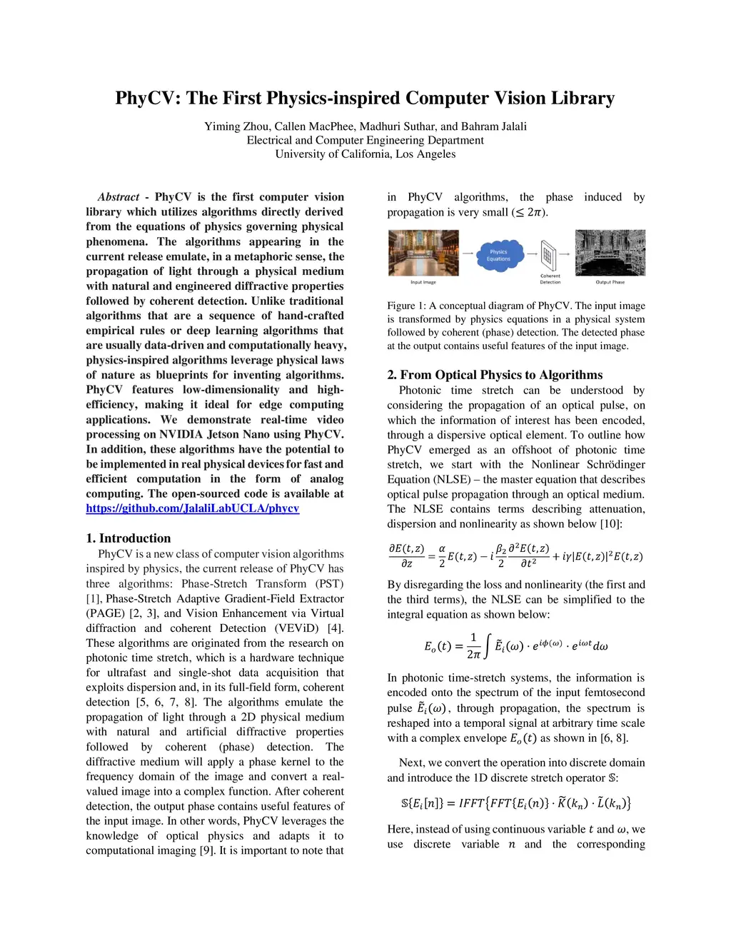PhyCV is the first computer vision library which utilizes algorithms directly derived from the equations of physics governing physical phenomena. The algorithms appearing in the current release emulate, in a metaphoric sense, the propagation of light through a physical medium with natural and engineered diffractive properties followed by coherent detection. Unlike traditional algorithms that are a sequence of hand-crafted empirical rules or deep learning algorithms that are usually data-driven and computationally heavy, physics-inspired algorithms leverage physical laws of nature as blueprints for inventing algorithms. PhyCV features low-dimensionality and high- efficiency, making it ideal for edge computing applications. We demonstrate real-time video processing on NVIDIA Jetson Nano using PhyCV. In addition, these algorithms have the potential to be implemented in real physical devices for fast and efficient computation in the form of analog computing. The open-sourced code is available at https://github.com/JalaliLabUCLA/phycv