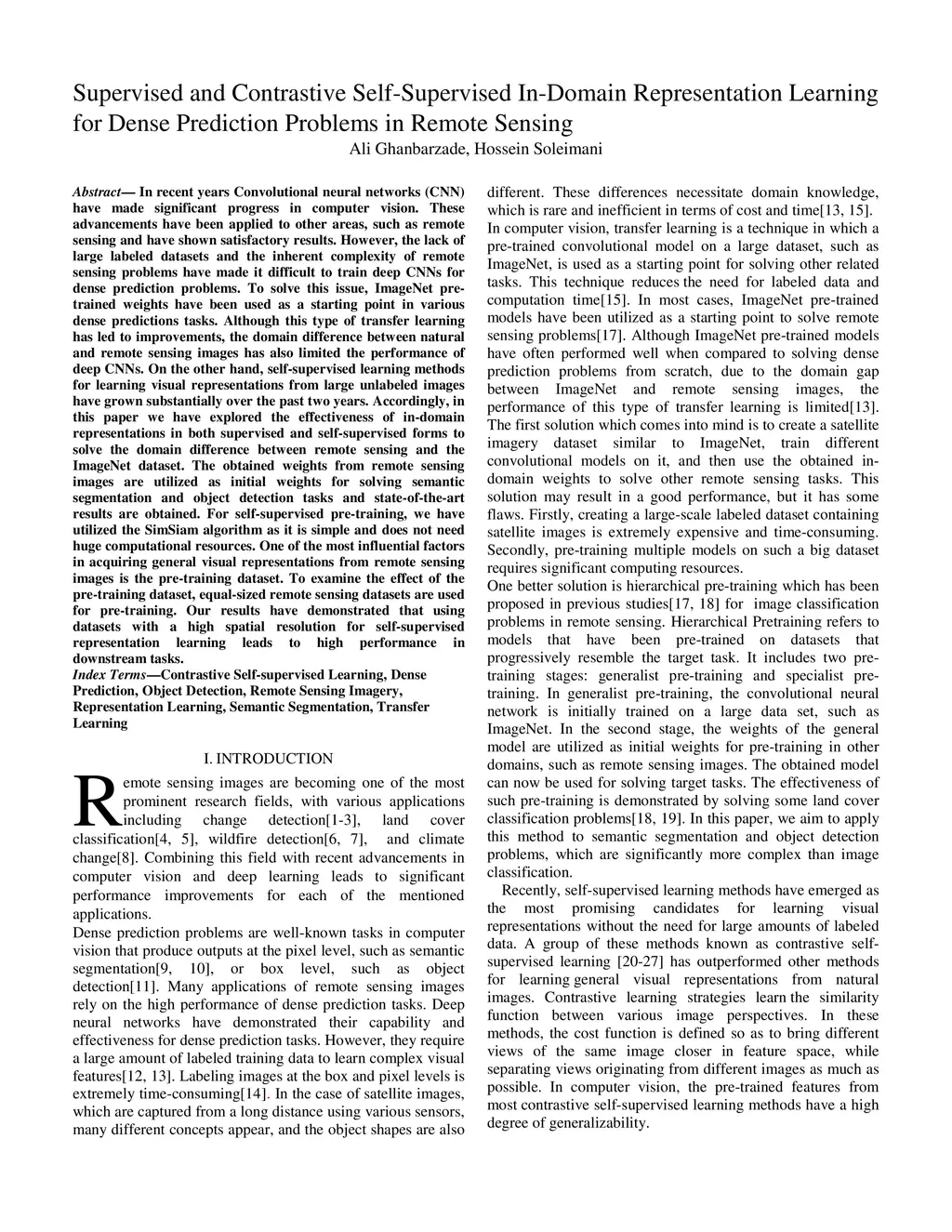 In recent years Convolutional neural networks (CNN) have made significant progress in computer vision. These advancements have been applied to other areas, such as remote sensing and have shown satisfactory results. However, the lack of large labeled datasets and the inherent complexity of remote sensing problems have made it difficult to train deep CNNs for dense prediction problems. To solve this issue, ImageNet pretrained weights have been used as a starting point in various dense predictions tasks. Although this type of transfer learning has led to improvements, the domain difference between natural and remote sensing images has also limited the performance of deep CNNs. On the other hand, self-supervised learning methods for learning visual representations from large unlabeled images have grown substantially over the past two years. Accordingly, in this paper we have explored the effectiveness of in-domain representations in both supervised and self-supervised forms to solve the domain difference between remote sensing and the ImageNet dataset. The obtained weights from remote sensing images are utilized as initial weights for solving semantic segmentation and object detection tasks and state-of-the-art results are obtained. For self-supervised pre-training, we have utilized the SimSiam algorithm as it is simple and does not need huge computational resources. One of the most influential factors in acquiring general visual representations from remote sensing images is the pre-training dataset. To examine the effect of the pre-training dataset, equal-sized remote sensing datasets are used for pre-training. Our results have demonstrated that using datasets with a high spatial resolution for self-supervised representation learning leads to high performance in downstream tasks.