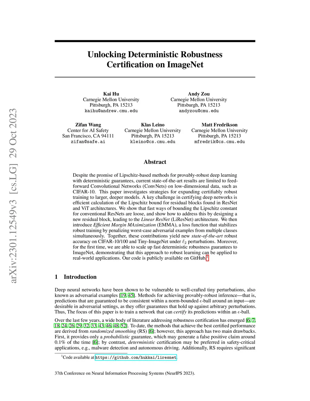 Despite the promise of Lipschitz-based methods for provably-robust deep learning with deterministic guarantees, current state-of-the-art results are limited to feed-forward Convolutional Networks (ConvNets) on low-dimensional data, such as CIFAR-10. This paper investigates strategies for expanding certifiably robust training to larger, deeper models. A key challenge in certifying deep networks is efficient calculation of the Lipschitz bound for residual blocks found in ResNet and ViT architectures. We show that fast ways of bounding the Lipschitz constant for conventional ResNets are loose, and show how to address this by designing a new residual block, leading to the \emph{Linear ResNet} (LiResNet) architecture. We then introduce \emph{Efficient Margin MAximization} (EMMA), a loss function that stabilizes robust training by simultaneously penalizing worst-case adversarial examples from \emph{all} classes. Together, these contributions yield new \emph{state-of-the-art} robust accuracy on CIFAR-10/100 and Tiny-ImageNet under perturbations. Moreover, for the first time, we are able to scale up fast deterministic robustness guarantees to ImageNet, demonstrating that this approach to robust learning can be applied to real-world applications. We release our code on Github: \url{https://github.com/klasleino/gloro}.