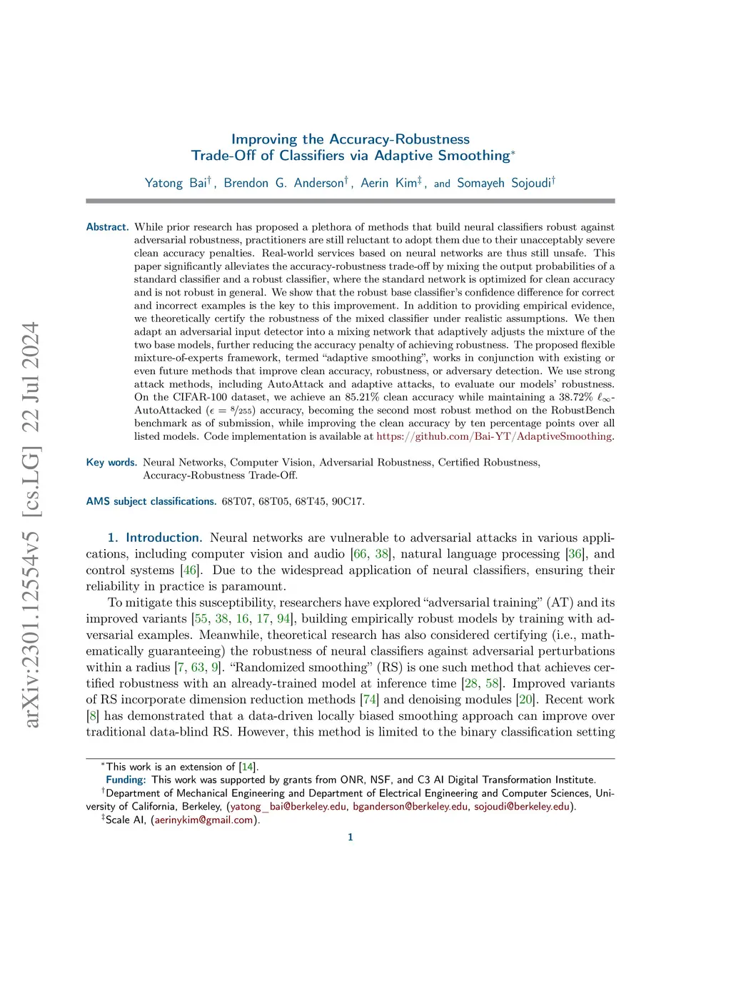 While prior research has proposed a plethora of methods that build neural classifiers robust against adversarial robustness, practitioners are still reluctant to adopt them due to their unacceptably severe clean accuracy penalties. This paper significantly alleviates this accuracy-robustness trade-off by mixing the output probabilities of a standard classifier and a robust classifier, where the standard network is optimized for clean accuracy and is not robust in general. We show that the robust base classifier's confidence difference for correct and incorrect examples is the key to this improvement. In addition to providing intuitions and empirical evidence, we theoretically certify the robustness of the mixed classifier under realistic assumptions. Furthermore, we adapt an adversarial input detector into a mixing network that adaptively adjusts the mixture of the two base models, further reducing the accuracy penalty of achieving robustness. The proposed flexible method, termed "adaptive smoothing", can work in conjunction with existing or even future methods that improve clean accuracy, robustness, or adversary detection. Our empirical evaluation considers strong attack methods, including AutoAttack and adaptive attack. On the CIFAR-100 dataset, our method achieves an 85.21% clean accuracy while maintaining a 38.72% -AutoAttacked () accuracy, becoming the second most robust method on the RobustBench CIFAR-100 benchmark as of submission, while improving the clean accuracy by ten percentage points compared with all listed models. The code that implements our method is available at https://github.com/Bai-YT/AdaptiveSmoothing.