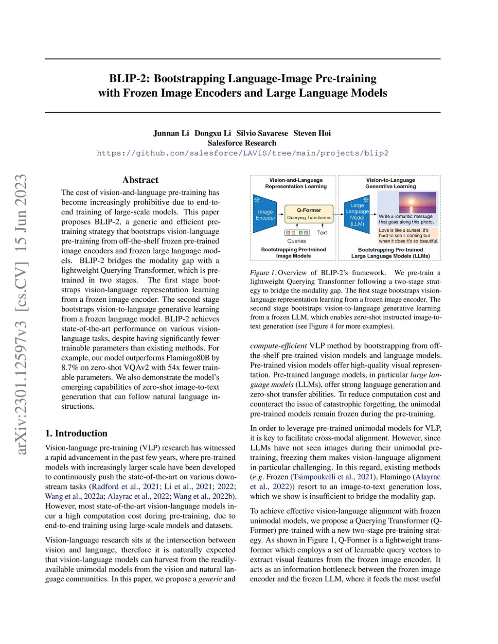 The cost of vision-and-language pre-training has become increasingly prohibitive due to end-to-end training of large-scale models. This paper proposes BLIP-2, a generic and efficient pre-training strategy that bootstraps vision-language pre-training from off-the-shelf frozen pre-trained image encoders and frozen large language models. BLIP-2 bridges the modality gap with a lightweight Querying Transformer, which is pre-trained in two stages. The first stage bootstraps vision-language representation learning from a frozen image encoder. The second stage bootstraps vision-to-language generative learning from a frozen language model. BLIP-2 achieves state-of-the-art performance on various vision-language tasks, despite having significantly fewer trainable parameters than existing methods. For example, our model outperforms Flamingo80B by 8.7% on zero-shot VQAv2 with 54x fewer trainable parameters. We also demonstrate the model's emerging capabilities of zero-shot image-to-text generation that can follow natural language instructions.