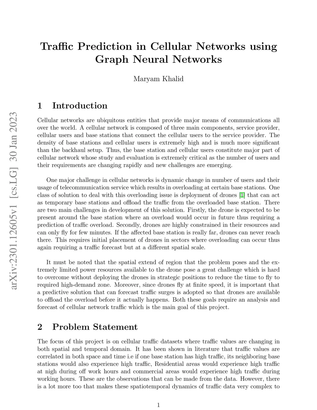 Cellular networks are ubiquitous entities that provide major means of communication all over the world. One major challenge in cellular networks is a dynamic change in the number of users and their usage of telecommunication service which results in overloading at certain base stations. One class of solution to deal with this overloading issue is the deployment of drones that can act as temporary base stations and offload the traffic from the overloaded base station. There are two main challenges in the development of this solution. Firstly, the drone is expected to be present around the base station where an overload would occur in the future thus requiring a prediction of traffic overload. Secondly, drones are highly constrained in their resources and can only fly for a few minutes. If the affected base station is really far, drones can never reach there. This requires the initial placement of drones in sectors where overloading can occur thus again requiring a traffic forecast but at a different spatial scale. It must be noted that the spatial extent of the region that the problem poses and the extremely limited power resources available to the drone pose a great challenge that is hard to overcome without deploying the drones in strategic positions to reduce the time to fly to the required high-demand zone. Moreover, since drone fly at a finite speed, it is important that a predictive solution that can forecast traffic surges is adopted so that drones are available to offload the overload before it actually happens. Both these goals require analysis and forecast of cellular network traffic which is the main goal of this project