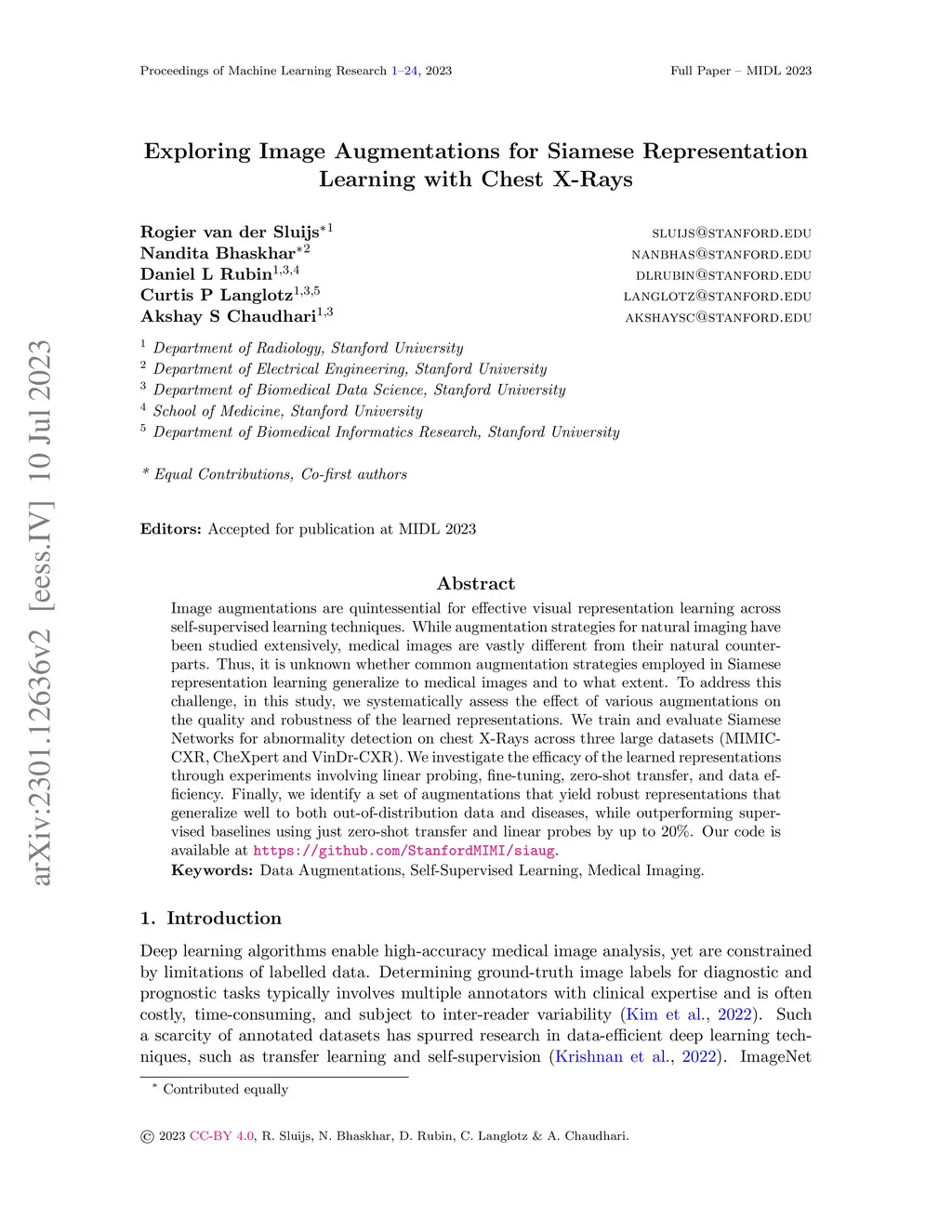 Image augmentations are quintessential for effective visual representation learning across self-supervised learning techniques. While augmentation strategies for natural imaging have been studied extensively, medical images are vastly different from their natural counterparts. Thus, it is unknown whether common augmentation strategies employed in Siamese representation learning generalize to medical images and to what extent. To address this challenge, in this study, we systematically assess the effect of various augmentations on the quality and robustness of the learned representations. We train and evaluate Siamese Networks for abnormality detection on chest X-Rays across three large datasets (MIMIC-CXR, CheXpert and VinDR-CXR). We investigate the efficacy of the learned representations through experiments involving linear probing, fine-tuning, zero-shot transfer, and data efficiency. Finally, we identify a set of augmentations that yield robust representations that generalize well to both out-of-distribution data and diseases, while outperforming supervised baselines using just zero-shot transfer and linear probes by up to 20%. Our code is available at https://github.com/StanfordMIMI/siaug.