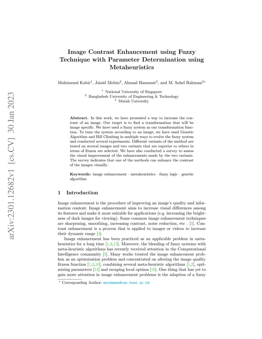 In this work, we have presented a way to increase the contrast of an image. Our target is to find a transformation that will be image specific. We have used a fuzzy system as our transformation function. To tune the system according to an image, we have used Genetic Algorithm and Hill Climbing in multiple ways to evolve the fuzzy system and conducted several experiments. Different variants of the method are tested on several images and two variants that are superior to others in terms of fitness are selected. We have also conducted a survey to assess the visual improvement of the enhancements made by the two variants. The survey indicates that one of the methods can enhance the contrast of the images visually.
