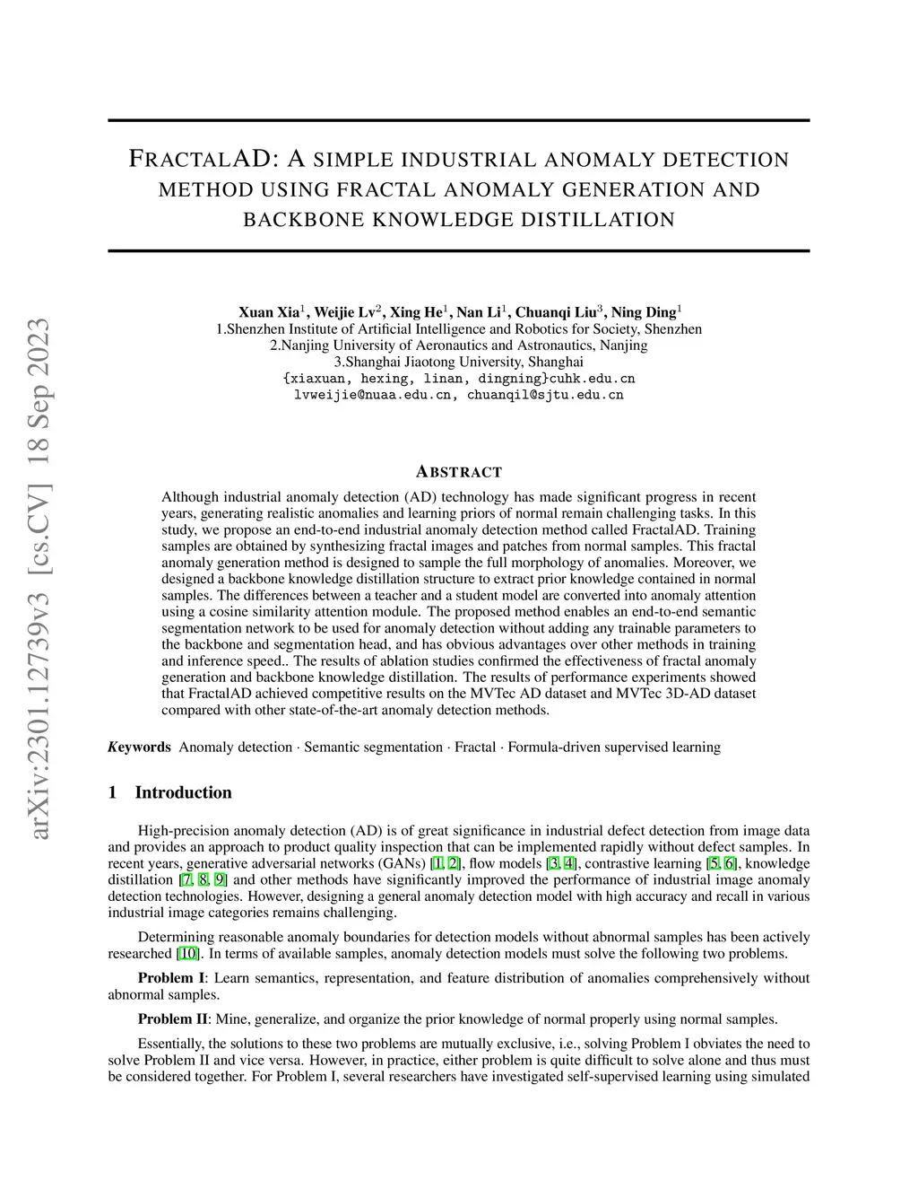 Although industrial anomaly detection (AD) technology has made significant progress in recent years, generating realistic anomalies and learning priors of normal remain challenging tasks. In this study, we propose an end-to-end industrial anomaly detection method called FractalAD. Training samples are obtained by synthesizing fractal images and patches from normal samples. This fractal anomaly generation method is designed to sample the full morphology of anomalies. Moreover, we designed a backbone knowledge distillation structure to extract prior knowledge contained in normal samples. The differences between a teacher and a student model are converted into anomaly attention using a cosine similarity attention module. The proposed method enables an end-to-end semantic segmentation network to be used for anomaly detection without adding any trainable parameters to the backbone and segmentation head, and has obvious advantages over other methods in training and inference speed.. The results of ablation studies confirmed the effectiveness of fractal anomaly generation and backbone knowledge distillation. The results of performance experiments showed that FractalAD achieved competitive results on the MVTec AD dataset and MVTec 3D-AD dataset compared with other state-of-the-art anomaly detection methods.