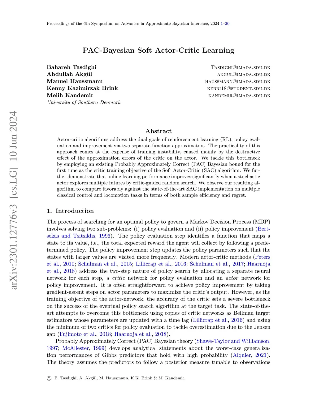 Actor-critic algorithms address the dual goals of reinforcement learning (RL), policy evaluation and improvement via two separate function approximators. The practicality of this approach comes at the expense of training instability, caused mainly by the destructive effect of the approximation errors of the critic on the actor. We tackle this bottleneck by employing an existing Probably Approximately Correct (PAC) Bayesian bound for the first time as the critic training objective of the Soft Actor-Critic (SAC) algorithm. We further demonstrate that online learning performance improves significantly when a stochastic actor explores multiple futures by critic-guided random search. We observe our resulting algorithm to compare favorably against the state-of-the-art SAC implementation on multiple classical control and locomotion tasks in terms of both sample efficiency and regret.
