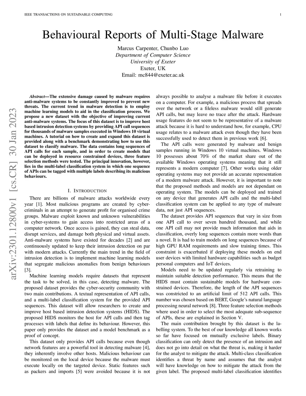 The extensive damage caused by malware requires anti-malware systems to be constantly improved to prevent new threats. The current trend in malware detection is to employ machine learning models to aid in the classification process. We propose a new dataset with the objective of improving current anti-malware systems. The focus of this dataset is to improve host based intrusion detection systems by providing API call sequences for thousands of malware samples executed in Windows 10 virtual machines. A tutorial on how to create and expand this dataset is provided along with a benchmark demonstrating how to use this dataset to classify malware. The data contains long sequences of API calls for each sample, and in order to create models that can be deployed in resource constrained devices, three feature selection methods were tested. The principal innovation, however, lies in the multi-label classification system in which one sequence of APIs can be tagged with multiple labels describing its malicious behaviours.