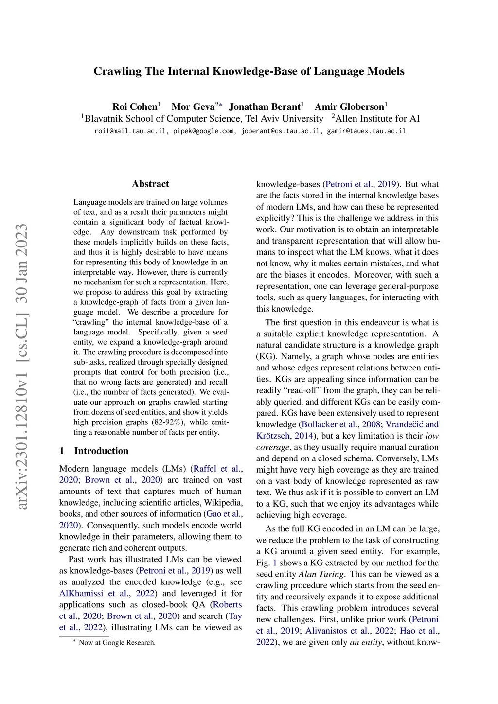 Language models are trained on large volumes of text, and as a result their parameters might contain a significant body of factual knowledge. Any downstream task performed by these models implicitly builds on these facts, and thus it is highly desirable to have means for representing this body of knowledge in an interpretable way. However, there is currently no mechanism for such a representation. Here, we propose to address this goal by extracting a knowledge-graph of facts from a given language model. We describe a procedure for ``crawling'' the internal knowledge-base of a language model. Specifically, given a seed entity, we expand a knowledge-graph around it. The crawling procedure is decomposed into sub-tasks, realized through specially designed prompts that control for both precision (i.e., that no wrong facts are generated) and recall (i.e., the number of facts generated). We evaluate our approach on graphs crawled starting from dozens of seed entities, and show it yields high precision graphs (82-92%), while emitting a reasonable number of facts per entity.