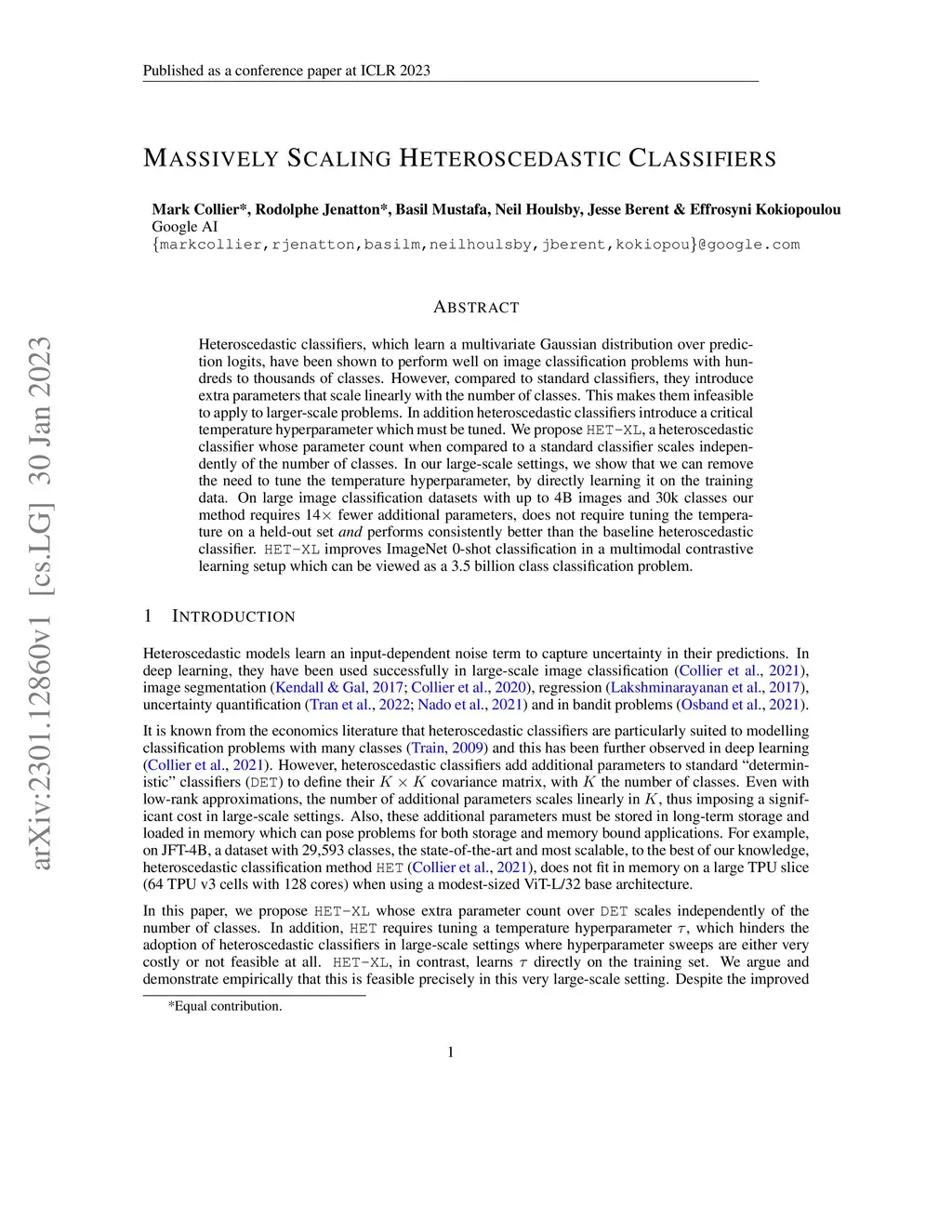 Heteroscedastic classifiers, which learn a multivariate Gaussian distribution over prediction logits, have been shown to perform well on image classification problems with hundreds to thousands of classes. However, compared to standard classifiers, they introduce extra parameters that scale linearly with the number of classes. This makes them infeasible to apply to larger-scale problems. In addition heteroscedastic classifiers introduce a critical temperature hyperparameter which must be tuned. We propose HET-XL, a heteroscedastic classifier whose parameter count when compared to a standard classifier scales independently of the number of classes. In our large-scale settings, we show that we can remove the need to tune the temperature hyperparameter, by directly learning it on the training data. On large image classification datasets with up to 4B images and 30k classes our method requires 14X fewer additional parameters, does not require tuning the temperature on a held-out set and performs consistently better than the baseline heteroscedastic classifier. HET-XL improves ImageNet 0-shot classification in a multimodal contrastive learning setup which can be viewed as a 3.5 billion class classification problem.
