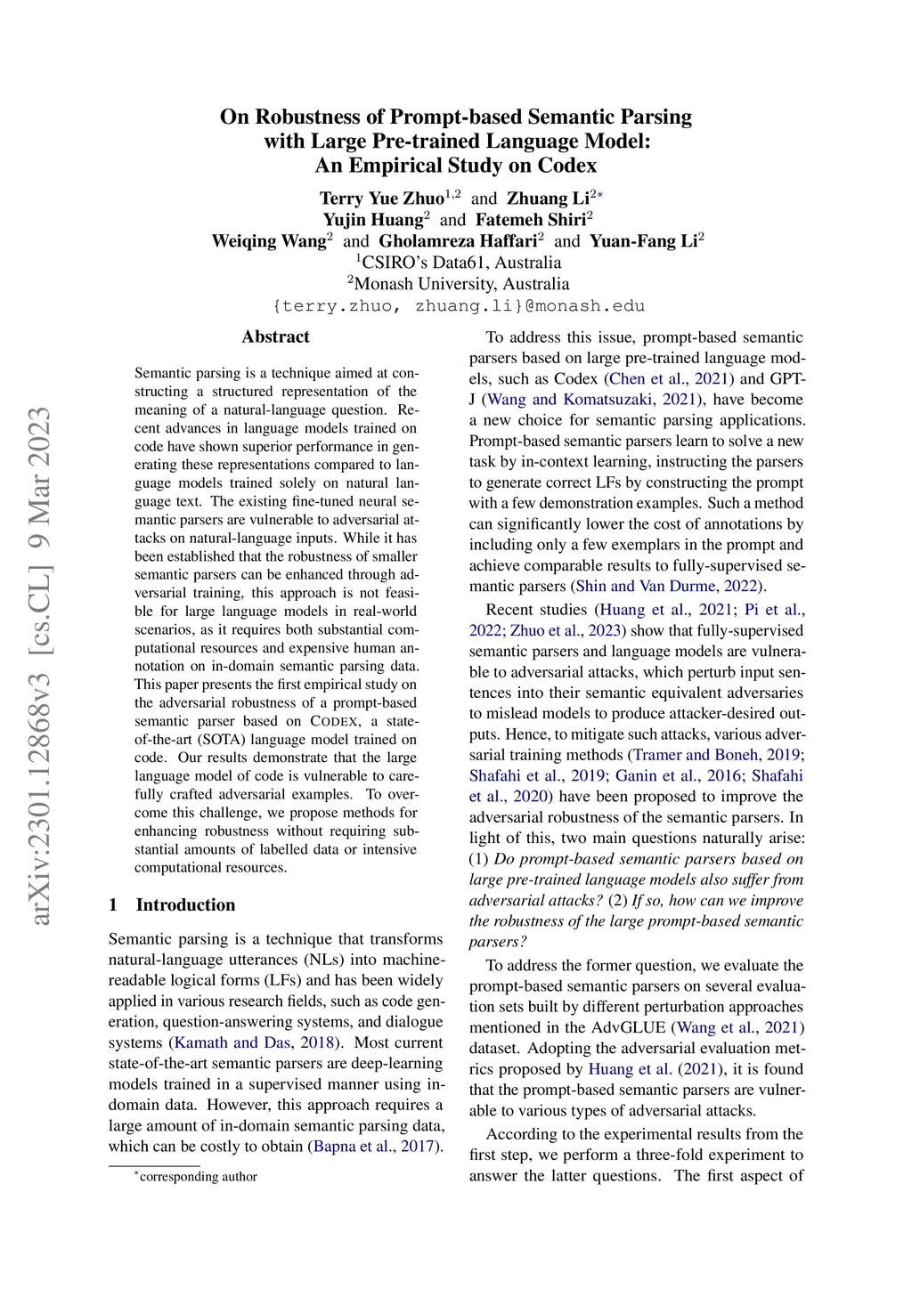 Semantic parsing is a technique aimed at constructing a structured representation of the meaning of a natural-language question. Recent advancements in few-shot language models trained on code have demonstrated superior performance in generating these representations compared to traditional unimodal language models, which are trained on downstream tasks. Despite these advancements, existing fine-tuned neural semantic parsers are susceptible to adversarial attacks on natural-language inputs. While it has been established that the robustness of smaller semantic parsers can be enhanced through adversarial training, this approach is not feasible for large language models in real-world scenarios, as it requires both substantial computational resources and expensive human annotation on in-domain semantic parsing data. This paper presents the first empirical study on the adversarial robustness of a large prompt-based language model of code, \codex. Our results demonstrate that the state-of-the-art (SOTA) code-language models are vulnerable to carefully crafted adversarial examples. To address this challenge, we propose methods for improving robustness without the need for significant amounts of labeled data or heavy computational resources.