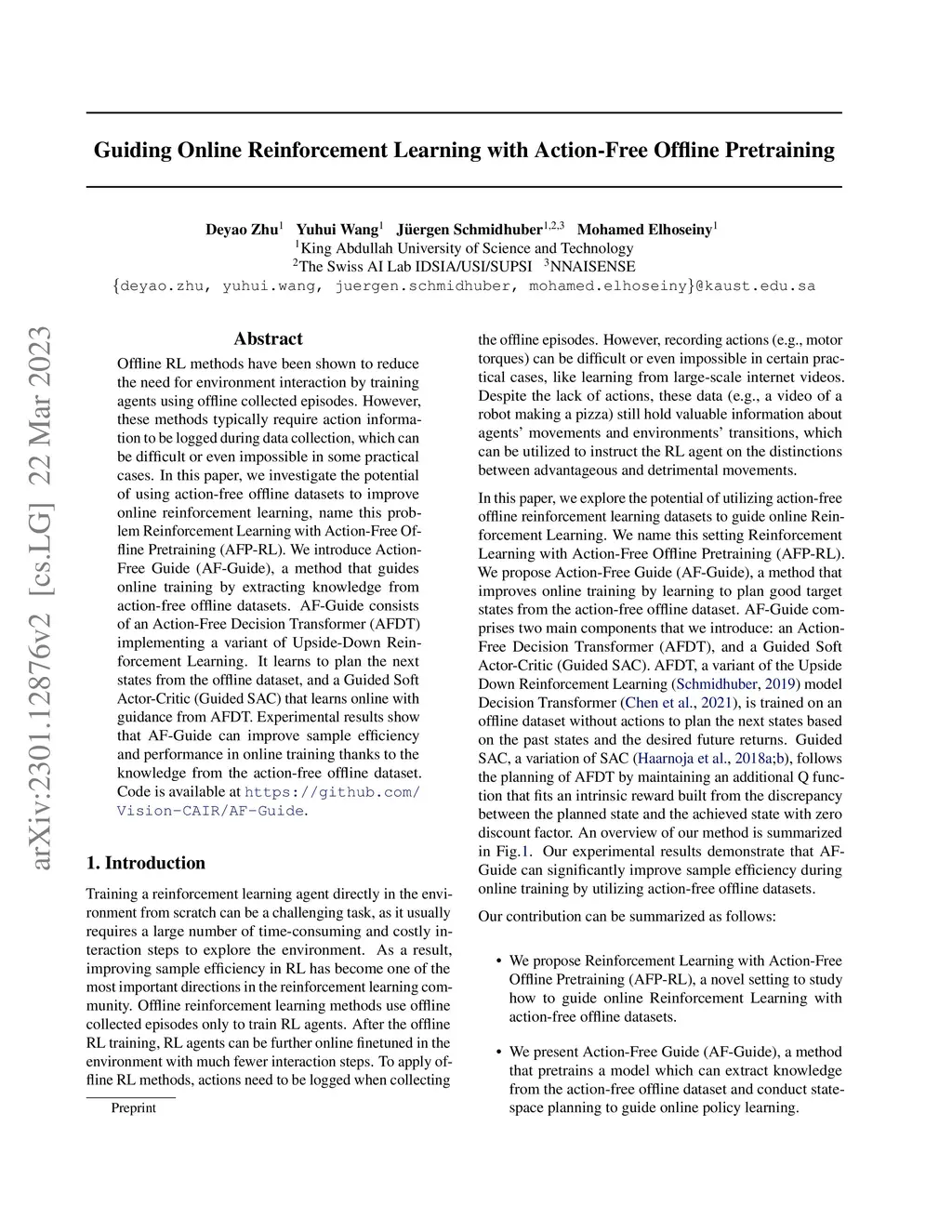 Offline RL methods have been shown to reduce the need for environment interaction by training agents using offline collected episodes. However, these methods typically require action information to be logged during data collection, which can be difficult or even impossible in some practical cases. In this paper, we investigate the potential of using action-free offline datasets to improve online reinforcement learning, name this problem Reinforcement Learning with Action-Free Offline Pretraining (AFP-RL). We introduce Action-Free Guide (AF-Guide), a method that guides online training by extracting knowledge from action-free offline datasets. AF-Guide consists of an Action-Free Decision Transformer (AFDT) implementing a variant of Upside-Down Reinforcement Learning. It learns to plan the next states from the offline dataset, and a Guided Soft Actor-Critic (Guided SAC) that learns online with guidance from AFDT. Experimental results show that AF-Guide can improve sample efficiency and performance in online training thanks to the knowledge from the action-free offline dataset. Code is available at https://github.com/Vision-CAIR/AF-Guide.