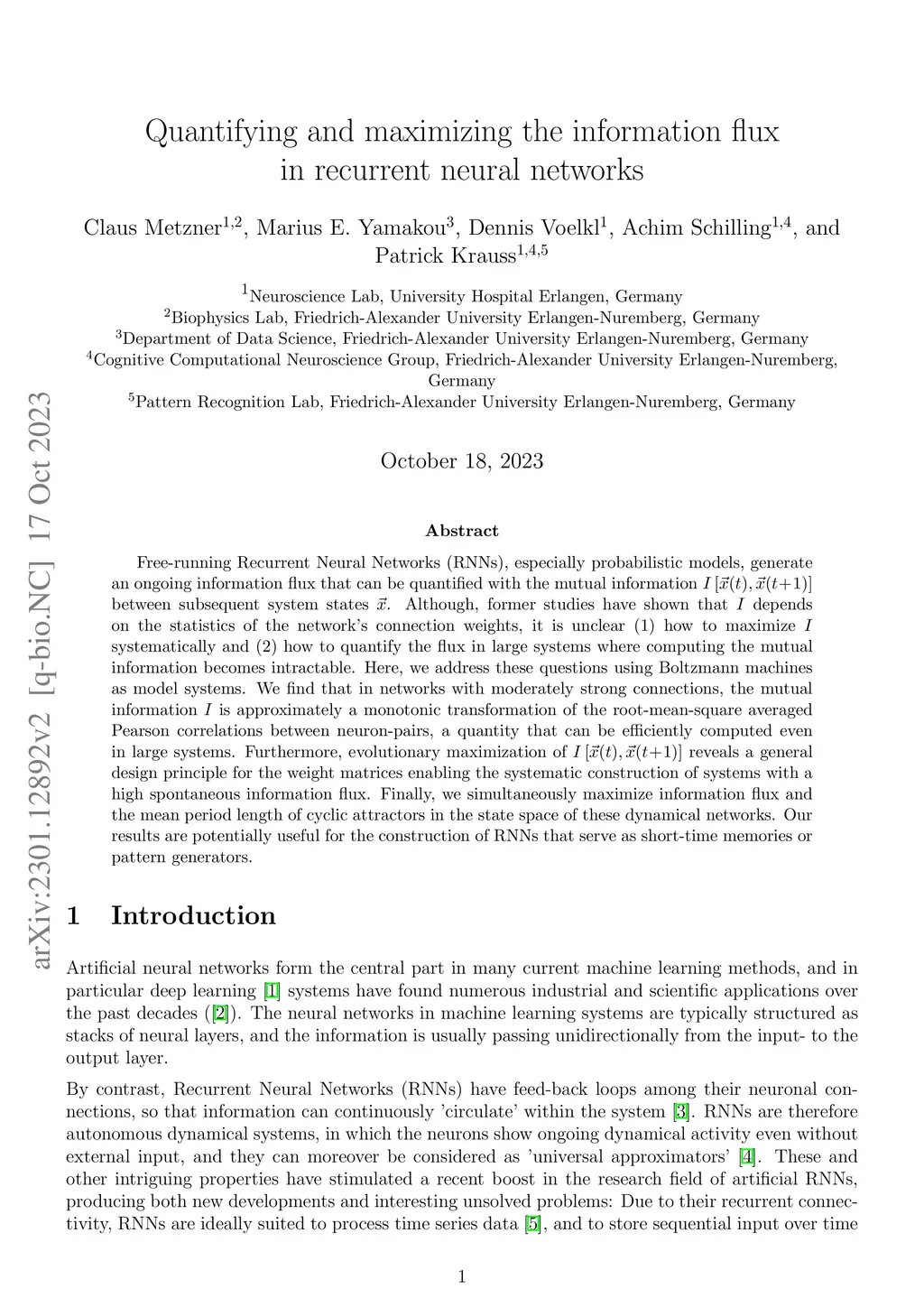 Free-running Recurrent Neural Networks (RNNs), especially probabilistic models, generate an ongoing information flux that can be quantified with the mutual information between subsequent system states . Although, former studies have shown that depends on the statistics of the network's connection weights, it is unclear (1) how to maximize systematically and (2) how to quantify the flux in large systems where computing the mutual information becomes intractable. Here, we address these questions using Boltzmann machines as model systems. We find that in networks with moderately strong connections, the mutual information is approximately a monotonic transformation of the root-mean-square averaged Pearson correlations between neuron-pairs, a quantity that can be efficiently computed even in large systems. Furthermore, evolutionary maximization of reveals a general design principle for the weight matrices enabling the systematic construction of systems with a high spontaneous information flux. Finally, we simultaneously maximize information flux and the mean period length of cyclic attractors in the state space of these dynamical networks. Our results are potentially useful for the construction of RNNs that serve as short-time memories or pattern generators.