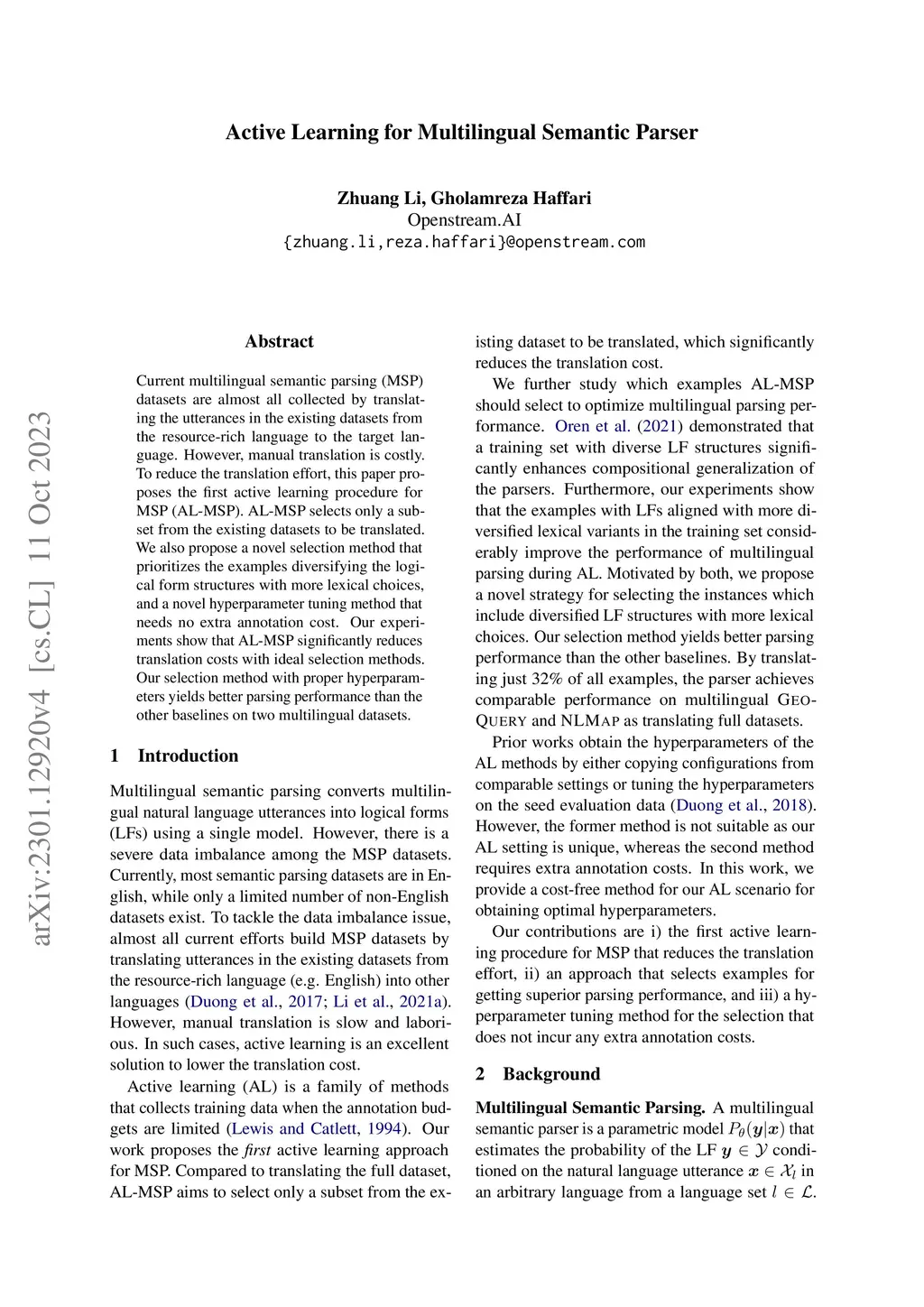 Current multilingual semantic parsing (MSP) datasets are almost all collected by translating the utterances in the existing datasets from the resource-rich language to the target language. However, manual translation is costly. To reduce the translation effort, this paper proposes the first active learning procedure for MSP (AL-MSP). AL-MSP selects only a subset from the existing datasets to be translated. We also propose a novel selection method that prioritizes the examples diversifying the logical form structures with more lexical choices, and a novel hyperparameter tuning method that needs no extra annotation cost. Our experiments show that AL-MSP significantly reduces translation costs with ideal selection methods. Our selection method with proper hyperparameters yields better parsing performance than the other baselines on two multilingual datasets.