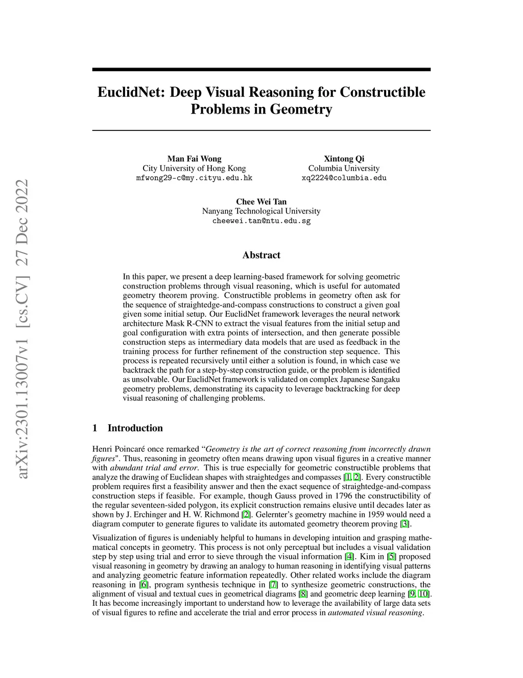 In this paper, we present a deep learning-based framework for solving geometric construction problems through visual reasoning, which is useful for automated geometry theorem proving. Constructible problems in geometry often ask for the sequence of straightedge-and-compass constructions to construct a given goal given some initial setup. Our EuclidNet framework leverages the neural network architecture Mask R-CNN to extract the visual features from the initial setup and goal configuration with extra points of intersection, and then generate possible construction steps as intermediary data models that are used as feedback in the training process for further refinement of the construction step sequence. This process is repeated recursively until either a solution is found, in which case we backtrack the path for a step-by-step construction guide, or the problem is identified as unsolvable. Our EuclidNet framework is validated on complex Japanese Sangaku geometry problems, demonstrating its capacity to leverage backtracking for deep visual reasoning of challenging problems.