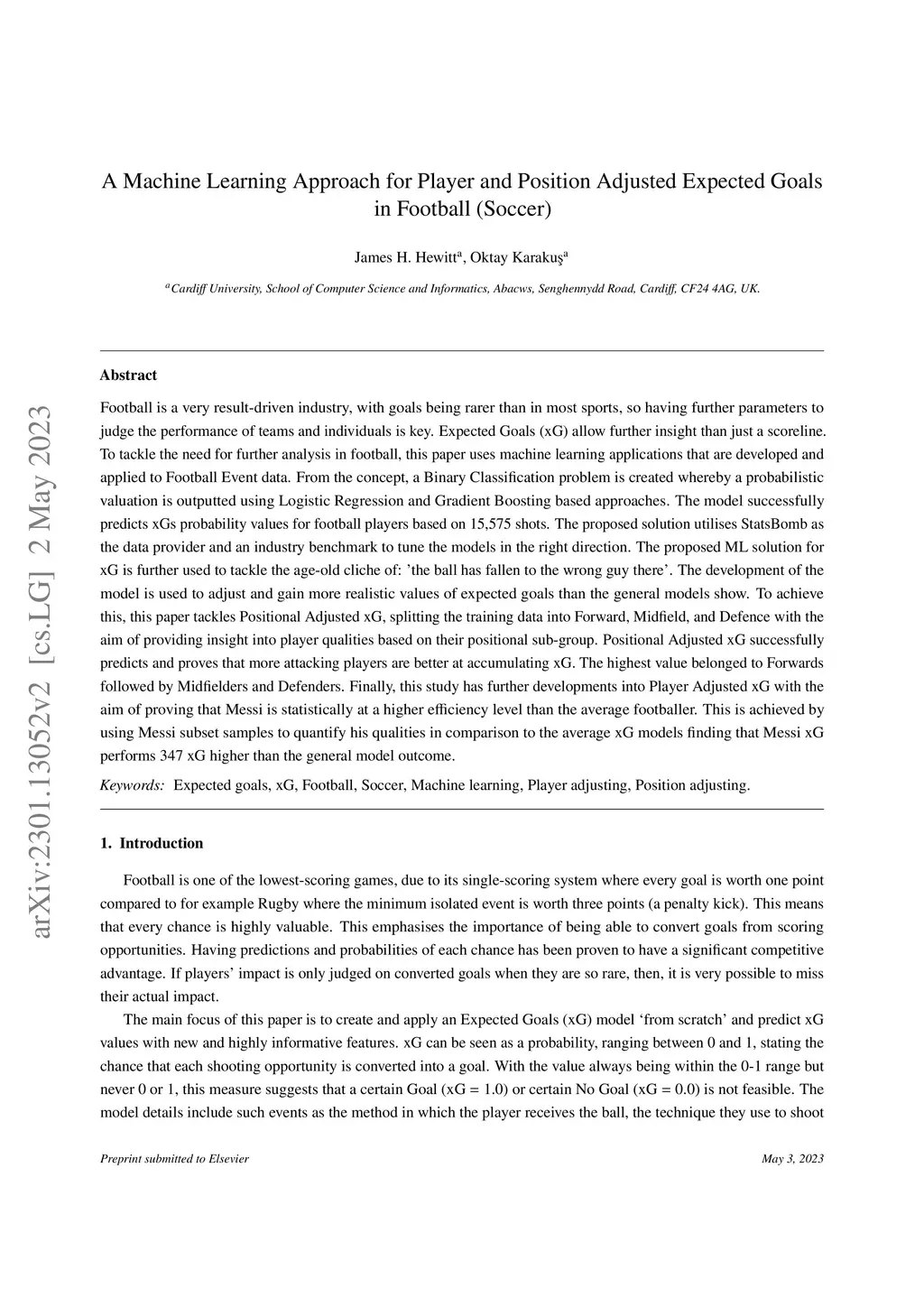 Football is a very result-driven industry, with goals being rarer than in most sports, so having further parameters to judge the performance of teams and individuals is key. Expected Goals (xG) allow further insight than just a scoreline. To tackle the need for further analysis in football, this paper uses machine learning applications that are developed and applied to Football Event data. From the concept, a Binary Classification problem is created whereby a probabilistic valuation is outputted using Logistic Regression and Gradient Boosting based approaches. The model successfully predicts xGs probability values for football players based on 15,575 shots. The proposed solution utilises StatsBomb as the data provider and an industry benchmark to tune the models in the right direction. The proposed ML solution for xG is further used to tackle the age-old cliche of: 'the ball has fallen to the wrong guy there'. The development of the model is used to adjust and gain more realistic values of expected goals than the general models show. To achieve this, this paper tackles Positional Adjusted xG, splitting the training data into Forward, Midfield, and Defence with the aim of providing insight into player qualities based on their positional sub-group. Positional Adjusted xG successfully predicts and proves that more attacking players are better at accumulating xG. The highest value belonged to Forwards followed by Midfielders and Defenders. Finally, this study has further developments into Player Adjusted xG with the aim of proving that Messi is statistically at a higher efficiency level than the average footballer. This is achieved by using Messi subset samples to quantify his qualities in comparison to the average xG models finding that Messi xG performs 347 xG higher than the general model outcome.
