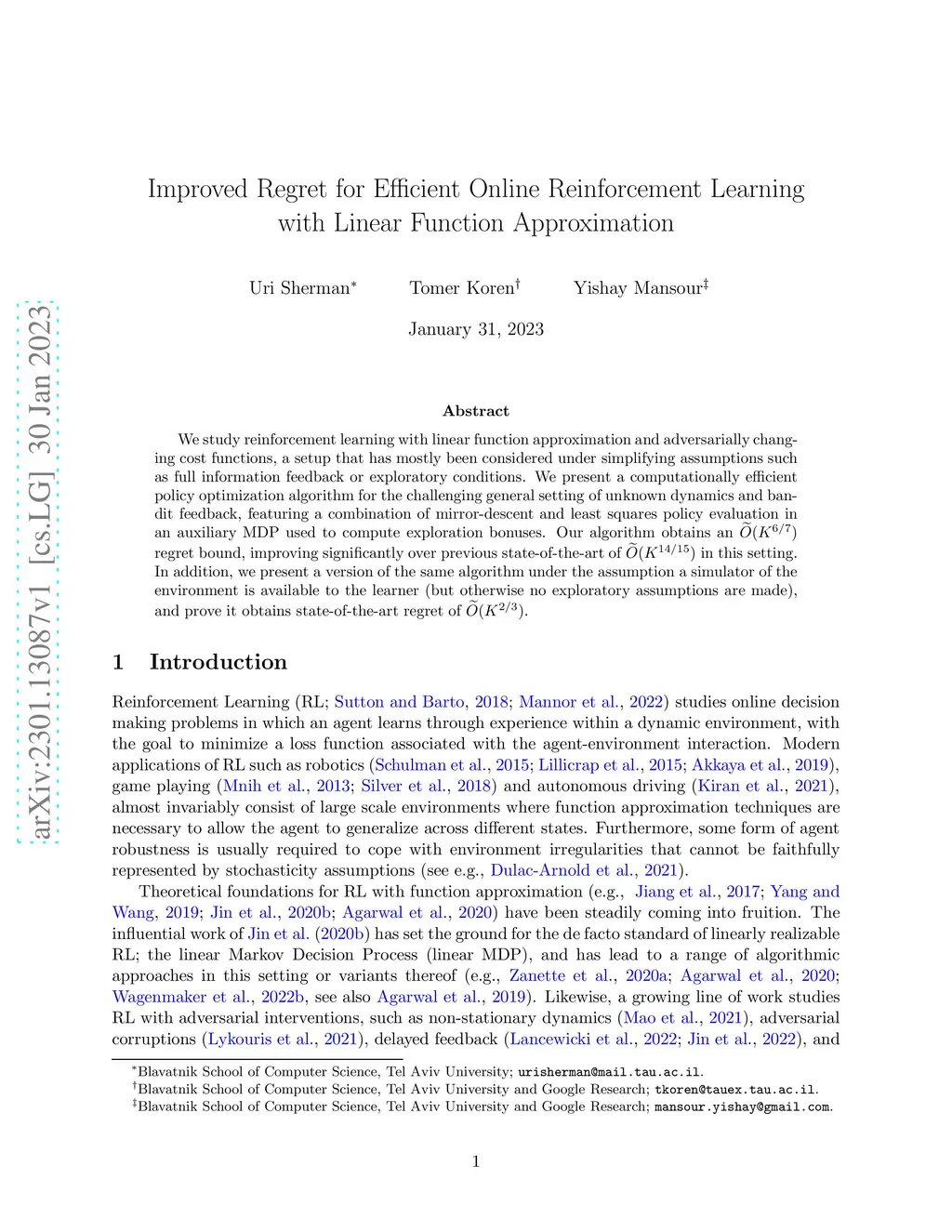 We study reinforcement learning with linear function approximation and adversarially changing cost functions, a setup that has mostly been considered under simplifying assumptions such as full information feedback or exploratory conditions.We present a computationally efficient policy optimization algorithm for the challenging general setting of unknown dynamics and bandit feedback, featuring a combination of mirror-descent and least squares policy evaluation in an auxiliary MDP used to compute exploration bonuses.Our algorithm obtains an regret bound, improving significantly over previous state-of-the-art of in this setting. In addition, we present a version of the same algorithm under the assumption a simulator of the environment is available to the learner (but otherwise no exploratory assumptions are made), and prove it obtains state-of-the-art regret of .