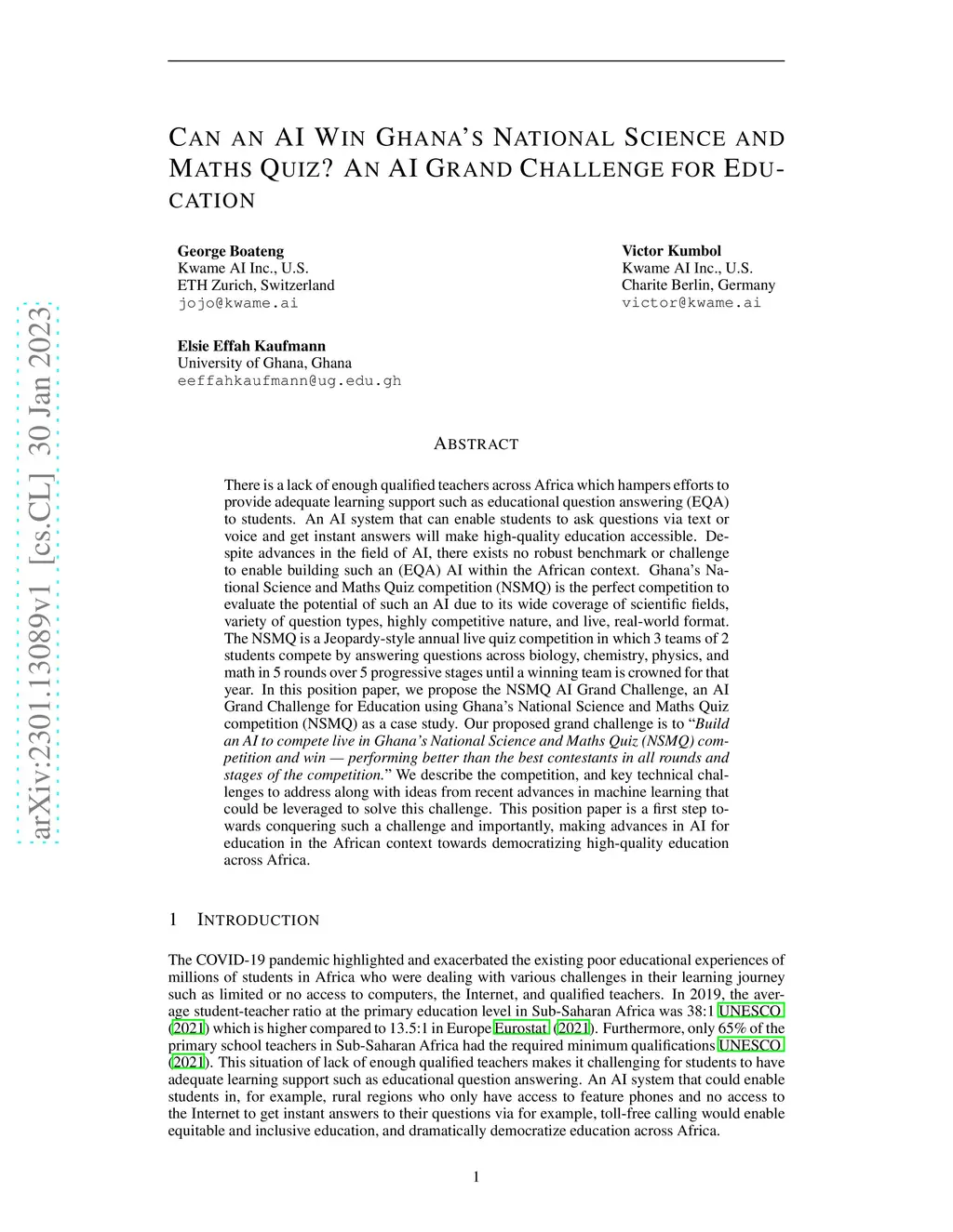 There is a lack of enough qualified teachers across Africa which hampers efforts to provide adequate learning support such as educational question answering (EQA) to students. An AI system that can enable students to ask questions via text or voice and get instant answers will make high-quality education accessible. Despite advances in the field of AI, there exists no robust benchmark or challenge to enable building such an (EQA) AI within the African context. Ghana's National Science and Maths Quiz competition (NSMQ) is the perfect competition to evaluate the potential of such an AI due to its wide coverage of scientific fields, variety of question types, highly competitive nature, and live, real-world format. The NSMQ is a Jeopardy-style annual live quiz competition in which 3 teams of 2 students compete by answering questions across biology, chemistry, physics, and math in 5 rounds over 5 progressive stages until a winning team is crowned for that year. In this position paper, we propose the NSMQ AI Grand Challenge, an AI Grand Challenge for Education using Ghana's National Science and Maths Quiz competition (NSMQ) as a case study. Our proposed grand challenge is to "Build an AI to compete live in Ghana's National Science and Maths Quiz (NSMQ) competition and win - performing better than the best contestants in all rounds and stages of the competition." We describe the competition, and key technical challenges to address along with ideas from recent advances in machine learning that could be leveraged to solve this challenge. This position paper is a first step towards conquering such a challenge and importantly, making advances in AI for education in the African context towards democratizing high-quality education across Africa.