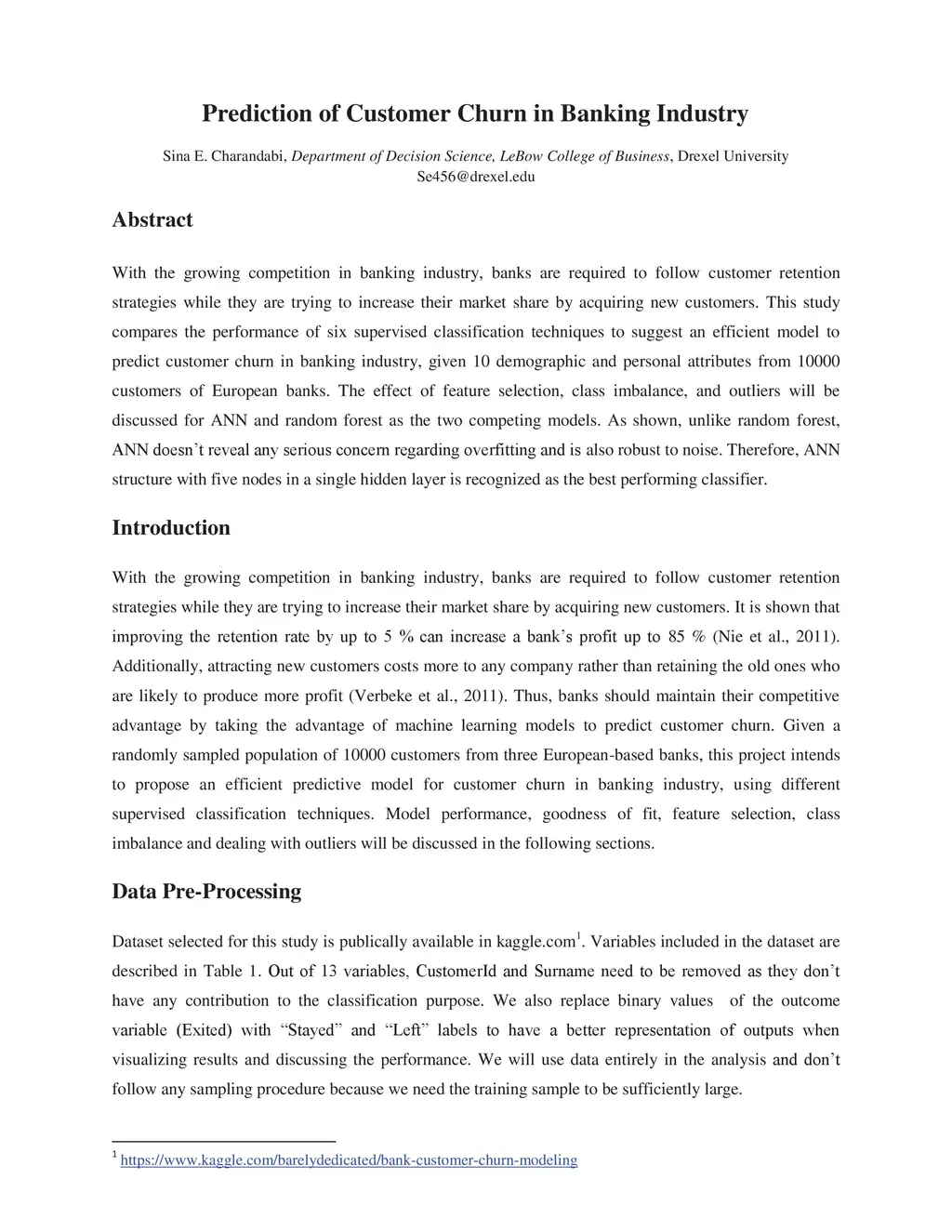 With the growing competition in banking industry, banks are required to follow customer retention strategies while they are trying to increase their market share by acquiring new customers. This study compares the performance of six supervised classification techniques to suggest an efficient model to predict customer churn in banking industry, given 10 demographic and personal attributes from 10000 customers of European banks. The effect of feature selection, class imbalance, and outliers will be discussed for ANN and random forest as the two competing models. As shown, unlike random forest, ANN does not reveal any serious concern regarding overfitting and is also robust to noise. Therefore, ANN structure with five nodes in a single hidden layer is recognized as the best performing classifier.