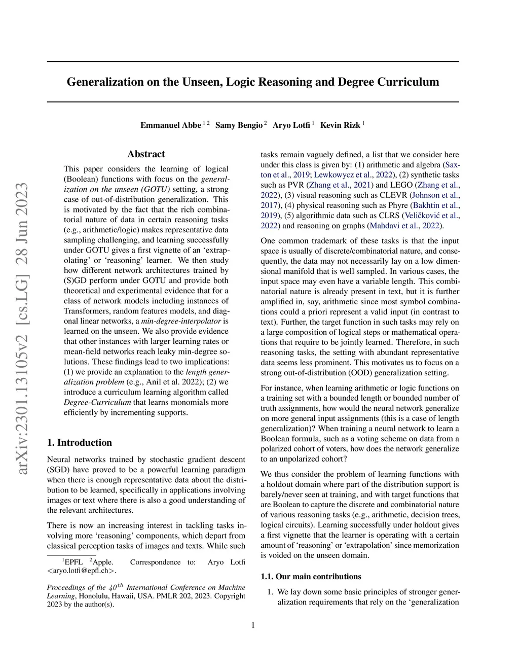 This paper considers the learning of logical (Boolean) functions with focus on the generalization on the unseen (GOTU) setting, a strong case of out-of-distribution generalization. This is motivated by the fact that the rich combinatorial nature of data in certain reasoning tasks (e.g., arithmetic/logic) makes representative data sampling challenging, and learning successfully under GOTU gives a first vignette of an éxtrapolating' or 'reasoning' learner. We then study how different network architectures trained by (S)GD perform under GOTU and provide both theoretical and experimental evidence that for a class of network models including instances of Transformers, random features models, and diagonal linear networks, a min-degree-interpolator is learned on the unseen. We also provide evidence that other instances with larger learning rates or mean-field networks reach leaky min-degree solutions. These findings lead to two implications: (1) we provide an explanation to the length generalization problem (e.g., Anil et al. 2022); (2) we introduce a curriculum learning algorithm called Degree-Curriculum that learns monomials more efficiently by incrementing supports.