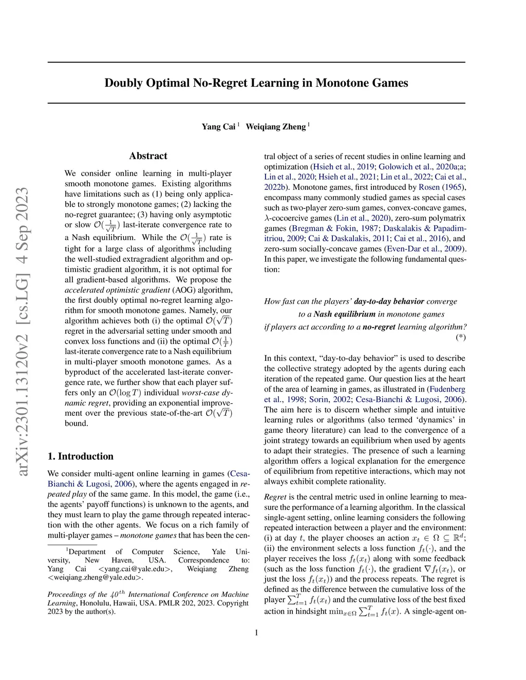 We consider online learning in multi-player smooth monotone games. Existing algorithms have limitations such as (1) being only applicable to strongly monotone games; (2) lacking the no-regret guarantee; (3) having only asymptotic or slow O(1T)O(\frac{1}{\sqrt{T}}) last-iterate convergence rate to a Nash equilibrium. While the O(1T)O(\frac{1}{\sqrt{T}}) rate is tight for a large class of algorithms including the well-studied extragradient algorithm and optimistic gradient algorithm, it is not optimal for all gradient-based algorithms. We propose the accelerated optimistic gradient (AOG) algorithm, the first doubly optimal no-regret learning algorithm for smooth monotone games. Namely, our algorithm achieves both (i) the optimal O(T)O(\sqrt{T}) regret in the adversarial setting under smooth and convex loss functions and (ii) the optimal O(1T)O(\frac{1}{T}) last-iterate convergence rate to a Nash equilibrium in multi-player smooth monotone games. As a byproduct of the accelerated last-iterate convergence rate, we further show that each player suffers only an O(logT)O(\log T) individual worst-case dynamic regret, providing an exponential improvement over the previous state-of-the-art O(T)O(\sqrt{T}) bound.