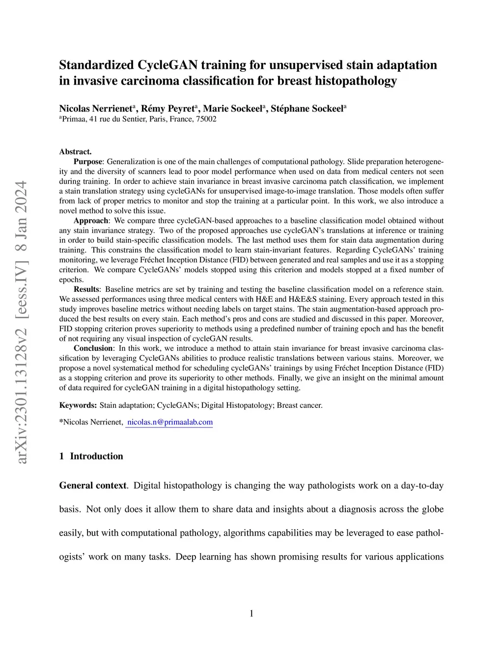 Standardized CycleGAN training for unsupervised stain adaptation in invasive carcinoma classification for breast histopathology