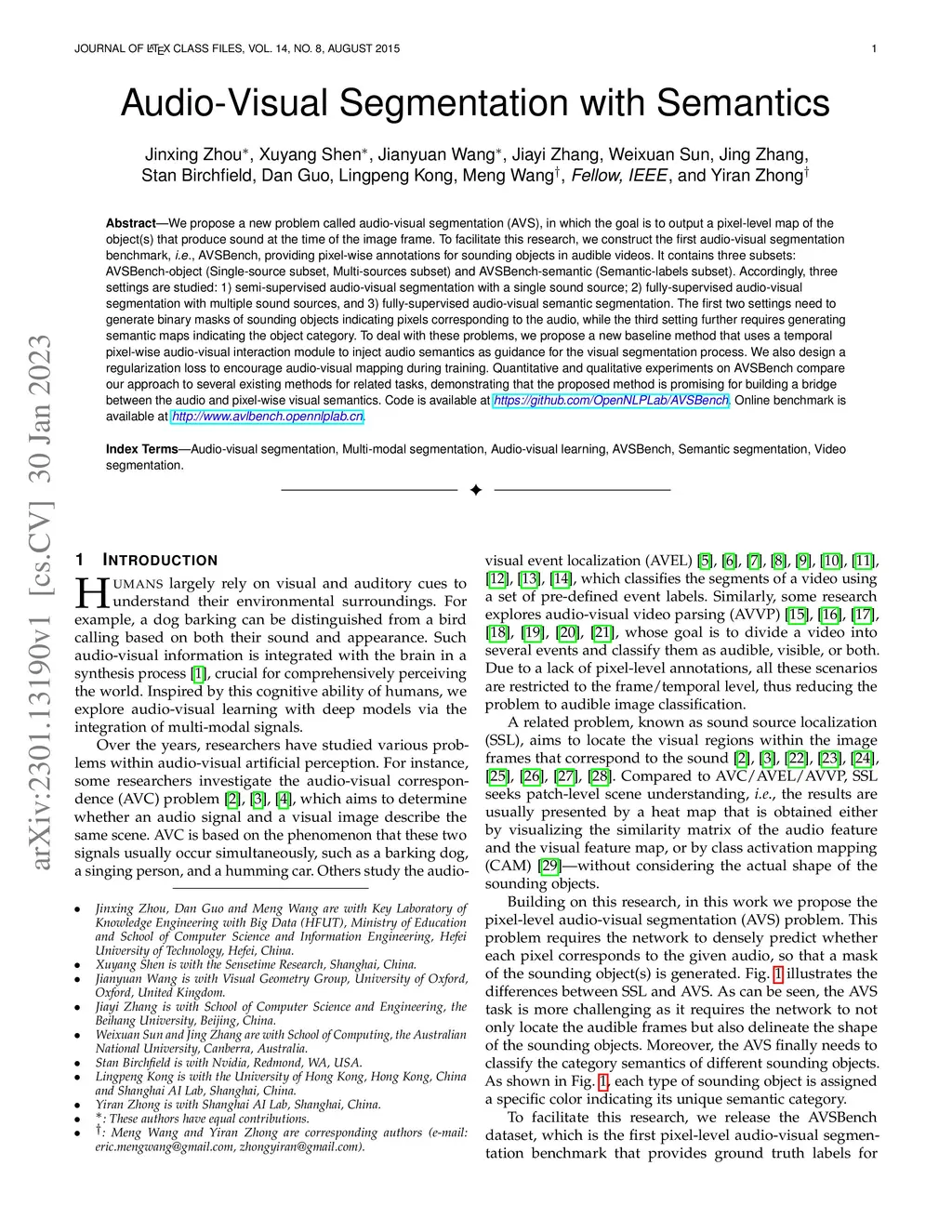 We propose a new problem called audio-visual segmentation (AVS), in which the goal is to output a pixel-level map of the object(s) that produce sound at the time of the image frame. To facilitate this research, we construct the first audio-visual segmentation benchmark, i.e., AVSBench, providing pixel-wise annotations for sounding objects in audible videos. It contains three subsets: AVSBench-object (Single-source subset, Multi-sources subset) and AVSBench-semantic (Semantic-labels subset). Accordingly, three settings are studied: 1) semi-supervised audio-visual segmentation with a single sound source; 2) fully-supervised audio-visual segmentation with multiple sound sources, and 3) fully-supervised audio-visual semantic segmentation. The first two settings need to generate binary masks of sounding objects indicating pixels corresponding to the audio, while the third setting further requires generating semantic maps indicating the object category. To deal with these problems, we propose a new baseline method that uses a temporal pixel-wise audio-visual interaction module to inject audio semantics as guidance for the visual segmentation process. We also design a regularization loss to encourage audio-visual mapping during training. Quantitative and qualitative experiments on AVSBench compare our approach to several existing methods for related tasks, demonstrating that the proposed method is promising for building a bridge between the audio and pixel-wise visual semantics. Code is available at https://github.com/OpenNLPLab/AVSBench. Online benchmark is available at http://www.avlbench.opennlplab.cn.